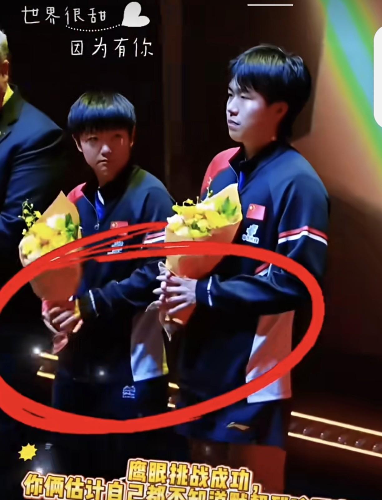 真不愧是天选混双哇!注意啦!看图二四六,两个人捧花的手,都是一模一样的手指交叉哟。 难怪网友要调侃,估计他们两个人都不知道默契到何种地步,简直是神了。 还有!中国大满贯比赛日,孙颖莎随着粉丝球迷一起喊了“孙颖莎”,还脆生生回到了一个“到”! 然后的然后,王楚钦决赛夺冠后被采访时,也喊了自己名字,还夸了自己一句“你挺棒的!” 所以哪怕很长时间没一起训练没一起参加混双比赛,真到了赛场,那八年并肩作战的默契可不是谁能说得清。 反正彼此的一个手势一个眼神就心领神会,因此他们是赛场上的神雕侠侣,他们是比翼双飞的好搭档。 反正我是坚定的薯条派,友友,你看了他们的比赛和相处的点点滴滴,还觉得他们仅仅只是队友搭档吗? #你问我答#