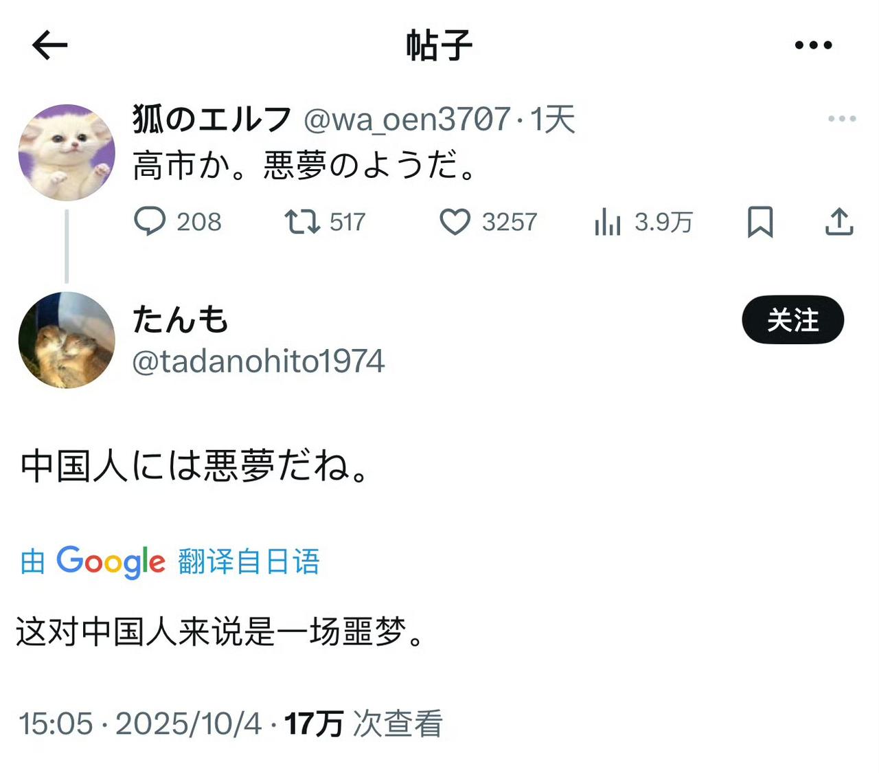 日本网民:高市早苗当选首相对中国人来说是一场噩梦! 呵呵,别过早下结论,回过头再说,看看究竟是日本人的噩梦还是中国人的噩梦吧!