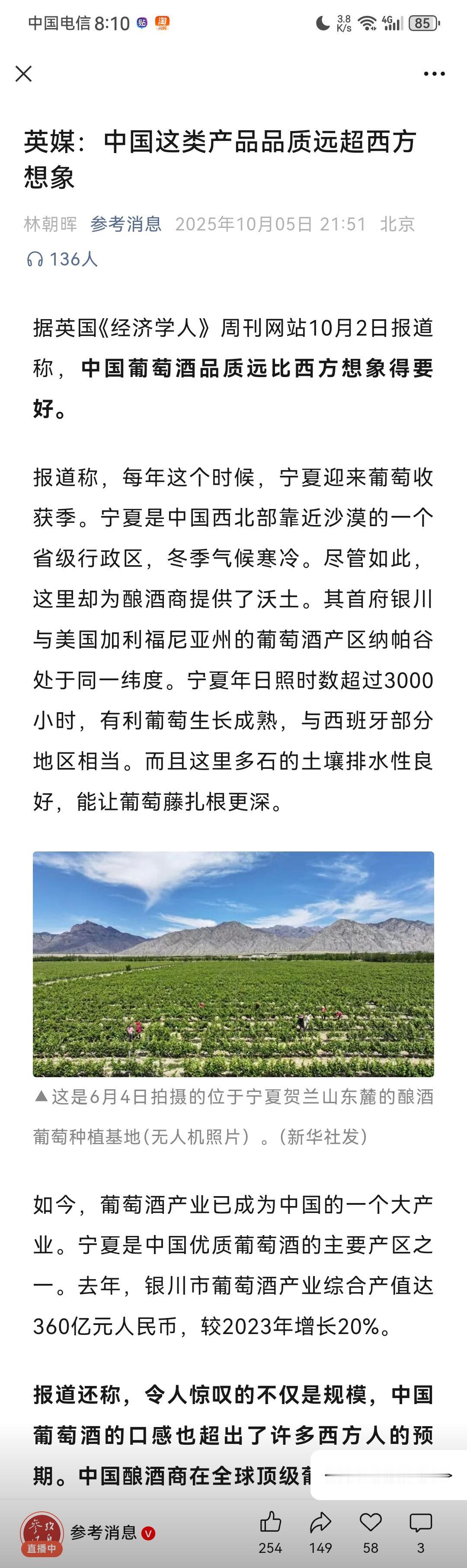 外媒破防了!因为就连在葡萄酒这个行业,我们都开始撼动欧盟的霸主地位。根据英国《经济学人》近日报道,他们调查了中国的葡萄酒行业之后,震惊发现,不知不觉间,中国葡萄酒的品质、产量,都发生了一个质的飞跃,远比西方想象的要好得多。 葡萄酒行业,可以说是一个规模十分庞大的产业,全球市场规模达到了惊人的3330亿美元,欧盟则是葡萄酒行业的绝对霸主,法国、意大利都是葡萄酒行业的佼佼者,不仅质量好,产量高,甚至还能推动当地旅游业的蓬勃发展。 悠久的历史,再加上品牌的赋能,欧盟在葡萄酒领域的霸主地位,几乎不可撼动。、 可现在,这样的局面,却开始变化了。 我们国内的葡萄酒行业,现在竟然也在飞速发展,主要是我们国家幅员辽阔,有很多极度适合酿酒的宝地,宁夏就是非常适合葡萄酒生产的一个省份,因为这里日照时间长,而且有着一种独特的排水性很好的多石土壤,这种土壤有利于葡萄扎根更深,从而使得葡萄的质量更好,这些地区的优良的生长环境,足以与欧盟那些最佳的葡萄酒酿造地媲美。 、 除此之外,则是技术实力的飞速提升,酿酒产业从某种程度上说也是一种工业,随着我国科技的发展,我们在酿酒行业的技术积累也渐渐加深,从而使得我们酿造出来的葡萄酒,口感一天比一天好,甚至都已经多次在国际性的品酒大会上取得各种具有极高含金量的奖牌。 优良的生长环境加上技术实力的飞速提升,使得我们的葡萄酒产业每年都在飞速进步,已经成为全球葡萄酒行业一颗冉冉升起的新星,具有越来越大的影响力! 因此,这一次就连外媒都是破防了,在各种工业领域被我们超过,也就罢了,现在就连葡萄酒这样的行业,他们的地位也都在动摇!