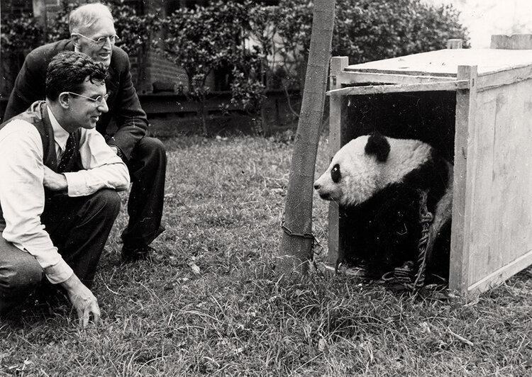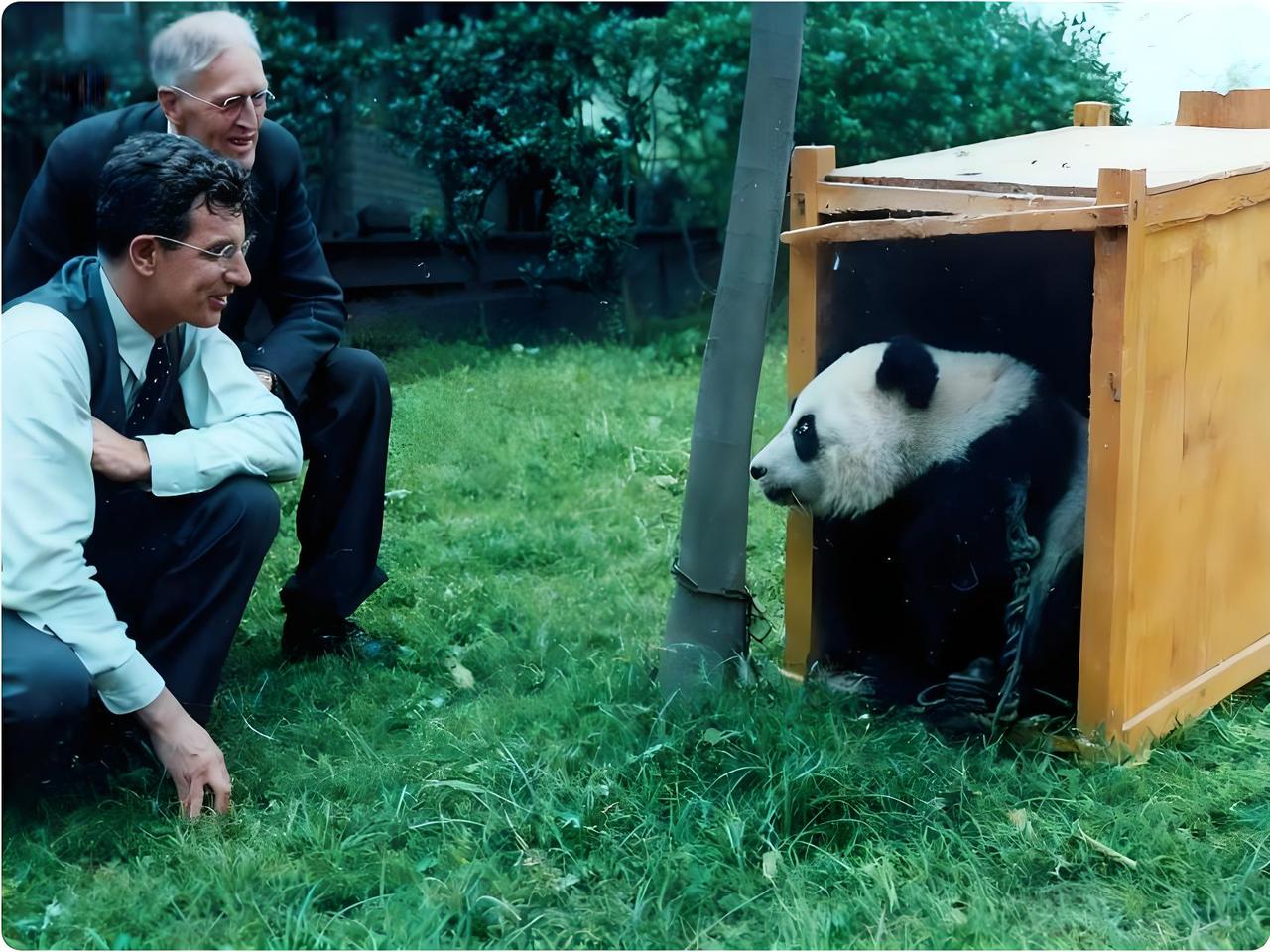 1942年的重庆,一张照片定格了D.C. Graham与Tee Van先生观察木笼中大熊猫的场景。画面里,两人俯身靠近质朴的木质笼子,目光专注地投向笼内,神情满是好奇与温和。 笼中的大熊猫,黑白分明的毛色憨态可掬——黑色的耳尖、眼圈与肩部绒毛,衬得白色的脸颊、脖颈与躯体愈发纯净,它正从笼内探出脑袋,圆敦敦的模样带着几分对周遭的懵懂。