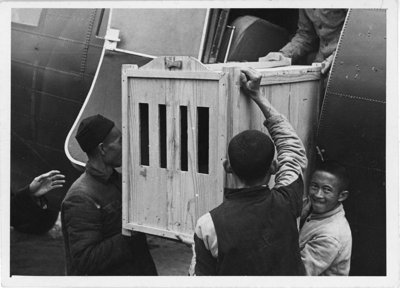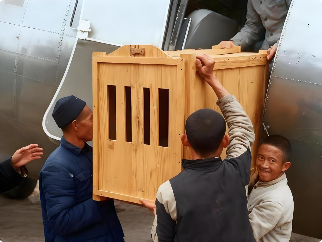1941年的重庆机场,机身泛着冷硬银灰色的飞机旁,几位工人正合力卸载一只特制的木质箱子。木箱呈质朴的浅棕色,侧面开着几道长条形透气孔,隐约传递出箱内生命的气息——那是被小心安置的熊猫。