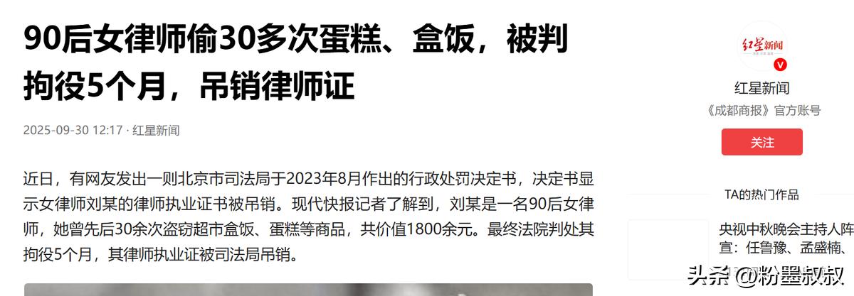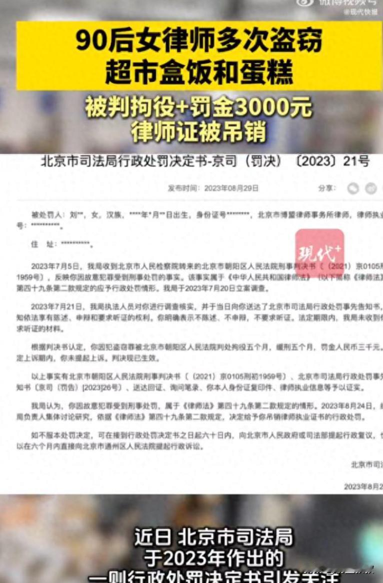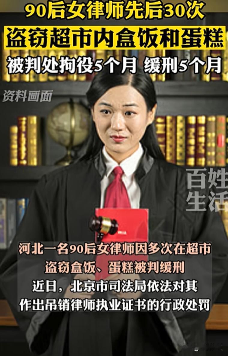 “知法犯法,罪加一等!”北京一90后女律师,为了贪小便宜,竟然利用自主结账设备,以不结账、少结账的方式,先后30余次盗窃超市盒饭、蛋糕等商品,共价值1800余元,可纸终究包不住火,她被抓后送上了法庭,法院判了! 事情发生在 2020 年,从 5 月到 9 月这四个月里,她总去家附近的超市,每次都用自助结账机付钱,可结账的时候总耍小聪明,看见货架上的盒饭、小蛋糕,还有偶尔拿的酸奶、零食,这些东西大多十几二十块钱,不算贵,她就故意少扫几个码,有时候甚至直接不扫,把东西揣进包里就走。 她大概觉得,每次就拿这么点,钱少超市不一定能发现,就算发现了也没啥大不了的,可她没算过次数,前后竟然偷了三十多次,加起来总共值一千八百多块钱。 一开始确实没人注意,自助结账机本来就靠自觉,工作人员也不能盯着每个人看,可架不住她次数太多,时间一长,超市的后台数据就出了问题,有些商品的出库量和结账量对不上,差得越来越多。 工作人员调了监控一查,才发现是她每次都在结账时动手脚,监控镜头把她怎么漏扫、怎么藏东西的小动作拍得清清楚楚一次都没落下。 没过多久超市就报了警,证据确凿她想抵赖也没用,很快就被找到了,到了 2021 年北京朝阳区法院开庭审了这个案子,其实法院也考虑到她的情况,她主动赔了超市所有损失,超市也出了谅解书,加上她自己签了认罪认罚,态度还算好,所以判得不算重 ,拘役五个月,缓刑五个月,再罚三千块钱。 这意思就是她不用真的去监狱坐牢,只要缓刑这五个月里不犯事,刑事上的处罚就算过去了,按理说,这已经是挺宽容的结果了。 可她忘了自己不只是个普通人,还是个律师刑事处罚过了,还有更严的职业规矩在等着她,2023 年 8 月,北京市司法局给她发了处罚通知书,直接吊销她的律师执业证。 这可不是小事,《律师法》里写得明明白白,只要因为故意犯罪受到刑事处罚,不管你判的是实刑还是缓刑,不管偷的钱是多是少,执业证都必须吊销没有任何商量的余地。 这下她是真的傻眼了,缓刑让她保住了人身自由,可没了律师证,她再也不能当律师了,这行是她学了好几年才入行的,本来前途好好的,就因为三十多次偷超市的小东西,彻底砸了自己的饭碗。 不光是律师,就连跟法律沾边的公司法务、法律咨询这些工作,估计也没人敢要她,毕竟有这么个 “知法犯法” 的污点在。 网友们知道这事儿后,都忍不住吐槽:“她可是律师啊,怎么会不知道偷东西是犯罪?还敢偷三十多次,这不是明知故犯吗?” 有人说普通人犯这错,可能也就是罚点钱、受点教育,可她是律师本来该是法律的践行者,结果自己成了违法的人,大家对她的期待更高,所以后果也更重,这就是 “罪加一等” 的道理。 其实仔细想想她犯的错真挺不值的,一千八百多块钱,对一个律师来说不算什么大钱,可她偏偏要贪这点小便宜,还抱着侥幸心理觉得不会被发现,她大概以为偷的钱少就没事,却忘了 “多次盗窃” 不管金额多少,只要够三次就算犯罪,现在好了刑事处罚留下案底,职业执照也没了,好好的人生轨迹全偏了。 (信息来源:红星新闻——90后女律师偷30多次蛋糕、盒饭,被判拘役5个月,吊销律师证)