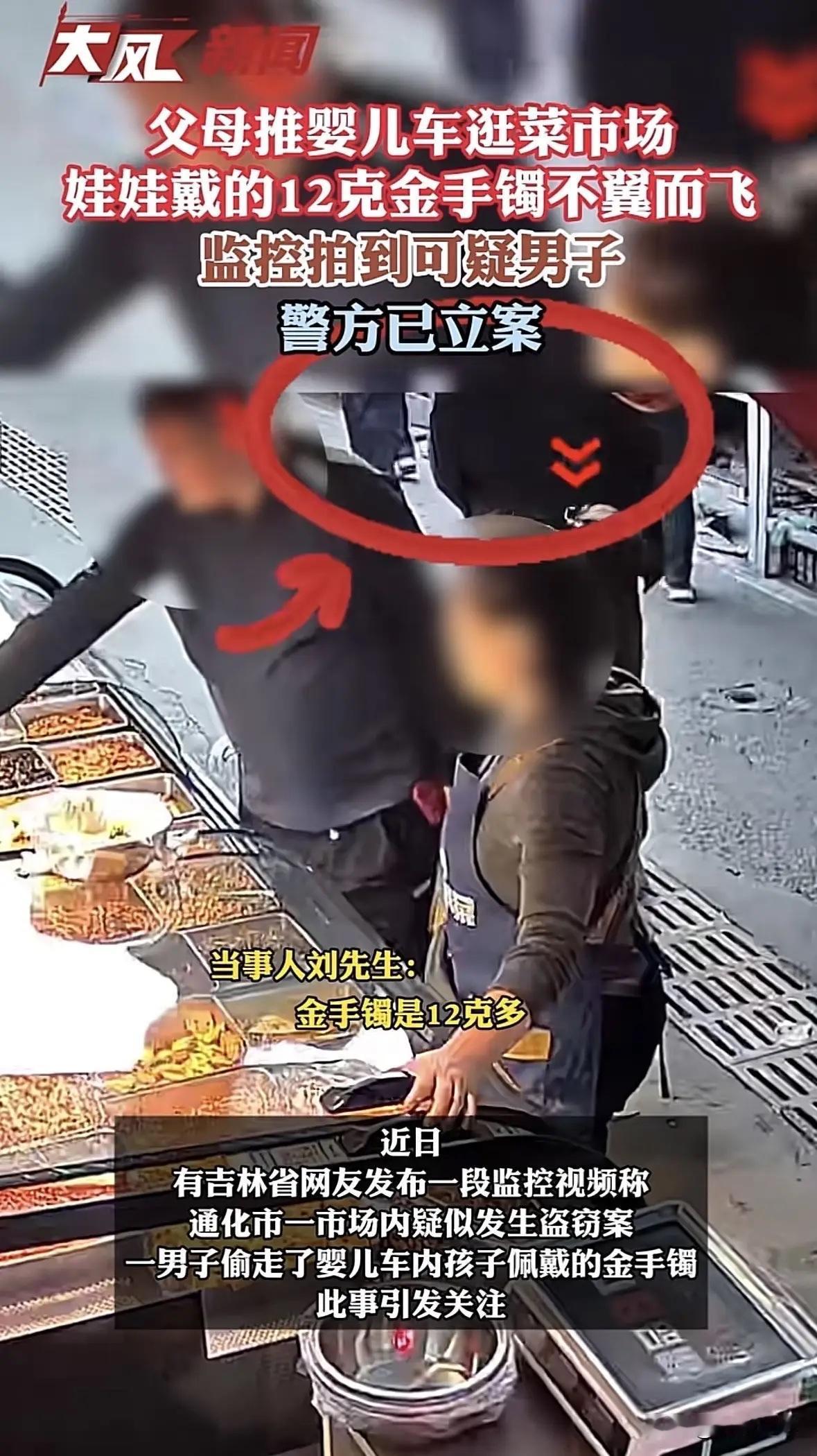 菜场挑咸菜的功夫,娃手上1万3金镯没了!监控揪出黑衣人,后续更闹心 吉林,夫妻二人推着婴儿车去逛菜场,他们给孩子手上戴了一个12g的金手镯,价值13000,谁知,就在他们挑个咸菜的功夫,再一扭头,孩子手上的金镯子不见了,夫妻俩连忙报警,帽子叔叔让他们找到证据了再报案,男子只好去调监控,还真就发现一个鬼鬼祟祟的黑衣男,在他们挑咸菜的时候把手伸进了婴儿车里,接着火速消失在人群中。这下证据确凿了,可后续却没夫妻俩想得那么顺利。 10月2号那天,刘先生和媳妇推着婴儿车带娃去市场买菜。 孩子手腕上戴着个亮闪闪的金镯子,足有12克重,按市价算得1万3。 刘先生后来跟人说,那镯子是孩子满月时丈母娘给打的,圈口特意选了能稍微活动的,想着孩子长大点还能戴,平时出门不常戴,那天正好丈母娘来家里,说“带娃出门戴着,图个吉利”,没成想反倒惹了麻烦。 菜场是老城区的露天市场,早上九点多正是人最多的时候,叫卖声、讨价还价声混在一起,挤得人挪不开脚。刘先生媳妇惦记着家里没咸菜了,就停在一个咸菜摊前挑拣,刘先生推着婴儿车站在旁边,眼睛还时不时瞟着孩子——小家伙才八个月大,坐在车里叼着安抚奶嘴,小手抓着车栏杆晃悠,金镯子在太阳底下晃得亮眼。 也就两三分钟的功夫,媳妇问刘先生“要酸豆角还是辣白菜”,刘先生转头应了句“都来点”,再转回头看孩子,心一下子揪紧了——孩子手腕上空空的,那只金镯子没影了!他赶紧蹲下来摸孩子的手,又翻了翻婴儿车的小毯子,连车底都看了,啥也没有。 刘先生掏出手机就打了110,等了十多分钟,民警赶了过来。听夫妻俩说完情况,民警皱着眉说“你们先别急,得先找着证据才行——是掉了还是被偷了?有没有人看见?”刘先生急得直跺脚“肯定是被偷了!就转个身的功夫,不可能自己掉了!”民警指了指菜场四周“这市场人太多,没直接证据,不好查,你们先去调监控,看看能不能拍到啥,有了线索再来报案。” 这话让刘先生心里有点堵,但也没办法,只能赶紧去找市场管理处。管理处的大爷听了来意,领着他去看监控——菜场主要通道装了四个监控,正好有一个对着咸菜摊的方向。画面虽然有点模糊,但能清楚看见,刘先生夫妻俩围着咸菜摊时,一个穿黑色连帽衫的男人凑了过来,先是假装看咸菜,眼睛却一直瞟着婴儿车,趁刘先生转头跟媳妇说话的间隙,飞快地把手伸进了婴儿车的栏杆缝里,动作快得像闪电,接着攥着个东西,低头往怀里一揣,转身就钻进了人群,没几秒就没了踪影。 原以为有了监控,抓小偷、找镯子是早晚的事,可接下来的日子,刘先生夫妻俩却天天盼着消息,天天失望。头三天,他们每天都给派出所打电话,民警要么说“正在排查线索”,要么说“菜场流动人口多,黑衣男没留下其他痕迹,还在查”。到了第五天,刘先生忍不住去了派出所,负责案子的民警跟他说,已经拿着监控截图去菜场周边的商铺、小区打听了,也问了咸菜摊摊主和当时在场的人,可没人认识那个黑衣男,也没人记得他往哪个方向跑了——那黑衣男戴了个口罩,连帽衫的帽子压得低,监控没拍到正脸,想找人难上加难。 更让刘先生窝火的是,他去菜场找咸菜摊摊主,想问问当时有没有看清黑衣男的样子,摊主却支支吾吾地说“当时人太多,我光顾着卖货了,没注意”;之前围着看热闹的人,也都说“没看清脸,就记得穿黑衣服”。刘先生没办法,又自己打印了几十张监控截图,贴在菜场入口和周边的电线杆上,上面写着“悬赏500元找线索”,可贴了好几天,除了几个打电话问“镯子找着没”的,啥有用的线索都没有。 有懂行的朋友跟刘先生说“这种菜场小偷,大多是流窜作案,偷了东西就赶紧找地方销赃,金镯子熔了重打,根本查不出来来源”,还提醒他“以后带娃出门,别戴贵重首饰,尤其是婴儿,没反抗能力,最容易被盯上”。刘先生这才后知后觉——当时光顾着图吉利,压根没想着,孩子手上的金镯子,在小偷眼里就是“移动的钱”,而自己和媳妇一时疏忽,正好给了小偷可乘之机。 这事儿传到网上,网友们也炸开了锅——有人骂小偷“连婴儿的东西都偷,太缺德了”,有人怪夫妻俩“心太大,明知道菜场人杂,还给孩子戴那么贵的镯子”,还有人吐槽“菜场监控模糊、管理松散,才让小偷有机可乘”。其实细想下来,这事儿里,刘先生夫妻俩的疏忽是真,小偷的贪婪是恶,但菜场的治安漏洞也不容忽视——露天市场人流密集,监控覆盖不全,摊主和顾客彼此不熟,正好成了小偷作案的“温床”。 刘先生现在最盼着的,就是民警能早点找到线索,哪怕镯子找不回来,也希望能把小偷抓住,别再让其他带娃的家长遭殃。他还在社交平台上发了自己的经历,提醒大家“带婴幼儿出门,千万别戴贵重首饰,看孩子比啥都重要,一秒钟都不能分心”。 各位读者你们怎么看?欢迎在评论区讨论。