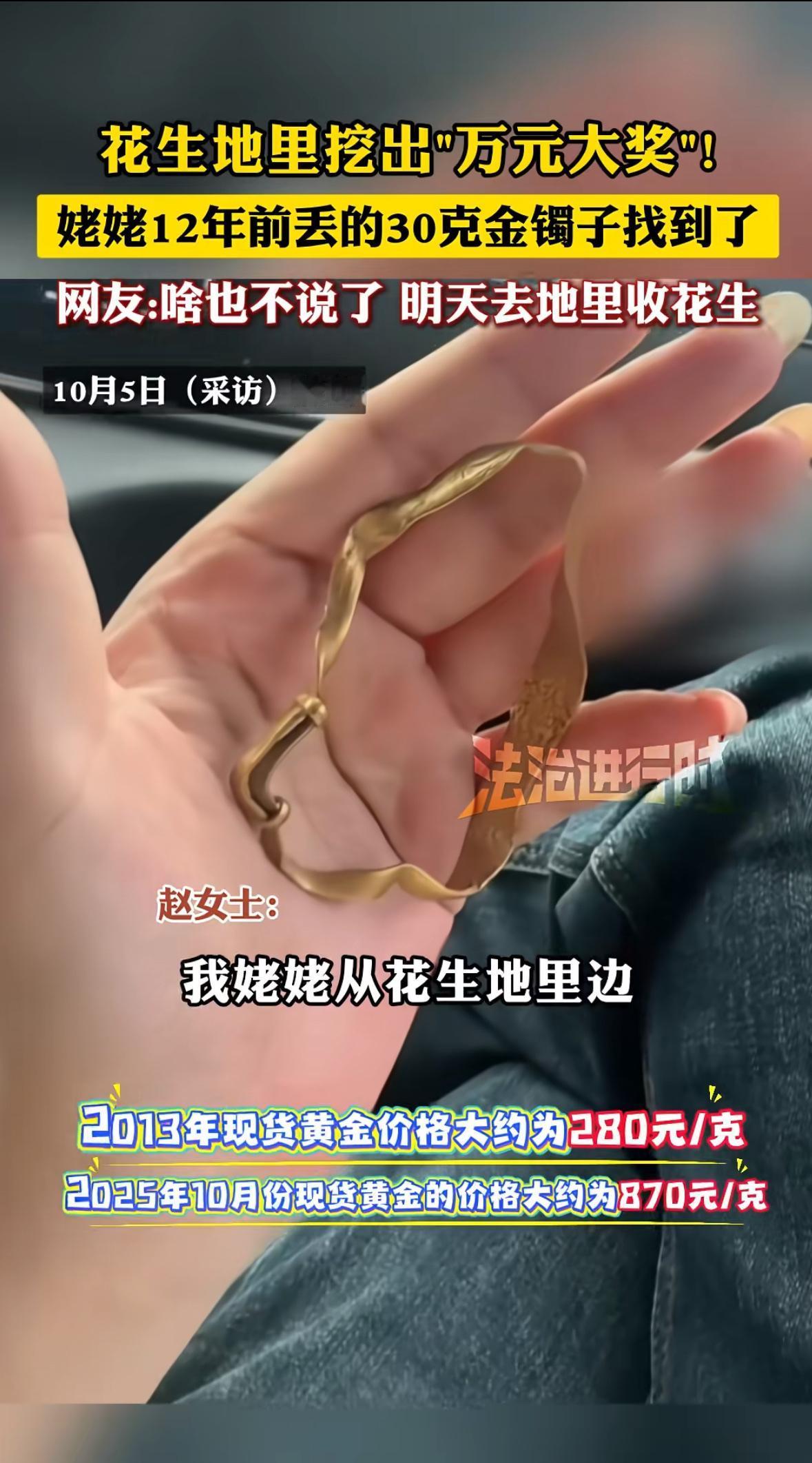 “妈!镯子找到了!”河南周口的小张跪在花生地里,举着沾满泥巴的金镯子大喊。地头晒太阳的姥姥眯着眼看了半天,突然“哇”地哭出声:“这是我嫁妆啊!丢了十二年,咋就在这儿呢?”这幕被小张用手机拍下来发到网上,瞬间冲上热搜——十二年没找到的金镯,竟在收花生时从土里“冒”了出来,网友集体破防:“这哪是收花生,这是收回了十二年的念想啊!” 花生地里的“奇迹”:十二年的等待终成真 小张回忆,那天全家正在地里收花生。他弯腰拔花生秧时,突然摸到土里有个硬疙瘩,抠出来一看,是个裹着泥巴的金属环。擦掉泥巴那刻,他差点把手机摔了——镯子内侧刻着“福”字,正是姥姥丢了十二年的陪嫁金镯! 原来,2012年秋天,姥姥像往常一样在地里收花生,回家后发现手腕上的金镯不见了。那镯子是姥姥出嫁时,太姥姥用三块银元打的,内侧刻着“福”字保平安。十二年来,全家把三亩花生地翻了个底朝天,连地头的野草都拔干净了,就是找不到。姥姥总念叨:“镯子跟着我五十多年,咋就丢了呢?”每次收花生,她都要蹲在地头看半天,直到腿疼得站不起来才回家。 这次找到镯子,小张第一个反应是拍视频。视频里,姥姥戴着老花镜,用布满皱纹的手反复摸镯子,突然把脸埋进镯子里哭:“我老觉得它还在地里,原来真在这儿啊!”小张妈妈在旁边抹眼泪:“妈找了十二年,我们陪她找了十二年,今天终于圆满了。” 丢失的不仅是镯子,更是一份念想 这镯子对姥姥来说,早不是个物件了。它是太姥姥临终前塞给她的“压箱底”,是五十年婚姻里丈夫送的唯一礼物,是三个孩子结婚时她都舍不得熔了打首饰的“传家宝”。十二年前丢的那天,姥姥坐在地头哭到天黑,回家后病了半个月。后来她总说:“镯子丢了,福气也丢了。” 小张说,这些年全家跟着“魔怔”了。每次收花生,爸爸都带着金属探测仪,妈妈拿着锄头一点点刨,他和小妹则趴在地上用手抠。邻居笑他们“钻钱眼儿里了”,可只有他们知道,找的不是金子,是姥姥的念想。“她总说镯子在土里等着她,我们不信,现在信了。”小张摸着视频里的镯子说。 更戳心的是,镯子找到那天,正好是太姥姥的忌日。小张说:“姥姥早上还念叨‘妈,我今天再去地里找找’,下午镯子就出来了。这哪是巧合,是太姥姥在天上看着呢。”视频里姥姥举着镯子对天空说:“妈,我找到了,您放心吧。”这句话,让无数网友跟着掉眼泪。 念想比金子更珍贵,珍惜眼前人最重要 这事儿最打动人的,不是金镯值多少钱,而是一份跨越十二年的牵挂。姥姥找了十二年,全家陪了十二年,这背后是“子欲养而亲不待”的恐惧,是“东西丢了还能找,人走了就再也见不着”的无奈。金镯能找回,可有些念想,一旦丢了就再也找不回来了。 现在年轻人总说“等有空了陪爸妈”“等有钱了给老人买东西”,可时间不等人啊。姥姥的镯子丢了十二年还能找回来,可要是人走了,连说句“我爱你”的机会都没有。视频里姥姥摸着镯子说“以后我走了,你们就把它传下去”,这话听着心酸——老人最在意的,从来不是金子银子,是子孙能记着她,能把她当回事。 金镯会旧,但念想永远新 十二年的等待,换来一个温暖的结局。这镯子现在成了全家的“宝贝”,姥姥逢人就显摆:“看,我妈给我的,又回来了。”小张说,以后每年收花生,他们都要带着镯子去地里:“让它看看,我们还在,家还在。” 最后想问问大家:你家里有这样的“传家宝”吗?是件旧衣服,是个破杯子,还是一句老话?这些东西可能不值钱,却藏着最珍贵的回忆。评论区说说你的故事——或许你的分享,能让更多人明白:念想比金子重,陪伴比等待长。别等丢了才找,别等走了才悔,现在,就去抱抱那个等你回家的人吧。 来源:头条热搜