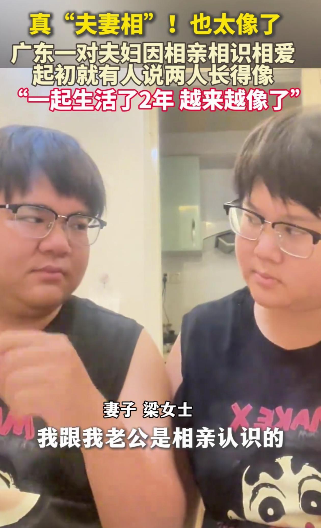 “这就是夫妻相!”广东一对小夫妻,俩人两年前经人介绍相亲,结果结婚同居两年后,亲戚朋友发现他们越来越像,同样是内双肿眼泡、双下巴、连笑起来嘴角的弧度都一模一样! 其实当初双方相亲的时候,媒人就说过他俩长得挺像的,但是一开始俩人也没在意啊。 可随着两个人相处的时间越来越久,两个人长得也是越来越像。尤其是表情、神态 更是非常接近。 这个时候再给丈夫戴上一顶假发,那两个人简直就像是双胞胎一样。 有人调侃道,现在离婚还得先做亲子鉴定! 也有人感慨,天天吃一锅饭,睡一张床,连表情都同步,能不像吗? 其实好多人找对象的时候,会不自觉地被和自己长得像的人吸引,这可能是人保护自己基因的一种本能。所以这对广东夫妻相亲时觉得对方顺眼,说不定早就有生物学基础了。 俩人过日子互相模仿,也是越来越像的重要原因。夫妻在一起时间长了,会不自觉地学对方的表情和动作。比如一个爱挑眉,另一个慢慢也会挑眉;一个喜欢抿嘴笑,另一个也会养成习惯。时间长了,面部肌肉运动轨迹一样,皱纹长的地方都相似。 这叫变色龙效应,越是亲密的人,越容易互相模仿。这对夫妻天天面对面,表情同步率高,长相趋同也不奇怪了。 所以啊,夫妻相是感情好的副产品。愿意一起生活,互相适应习惯,连长相都会慢慢靠近。这可不是玄学,而是天天在一起互相影响的结果。要是两口子整天吵架,估计也模仿不来对方的笑脸,你说呢? #广东一对夫妇长得像“复制粘贴”#