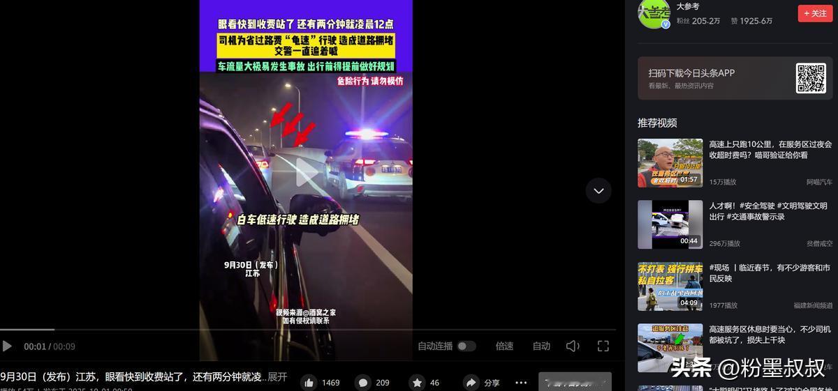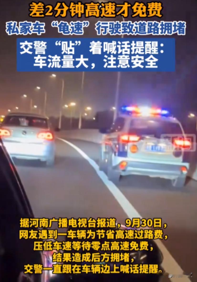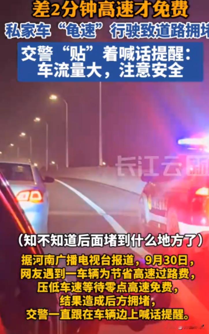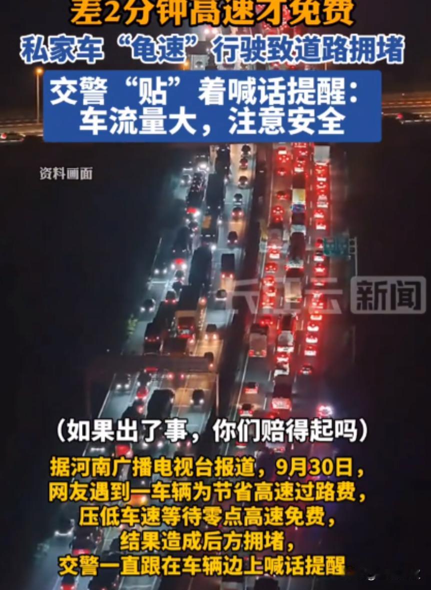 “良心不会痛吗?”男子为了蹭高速免费,选择提前上高速,结果,预估出现偏差,在即将达到收费站下高速时,发现还有2分钟才到12点,男子竟然故意压低车速,比龟速还要龟速,导致后方车辆急刹,并造成严重拥堵,交警“贴”脸开大:知不知道后面堵到什么地方了?如果出了事,你赔得起吗? 节假日前夜的高速路,本来就堵得让人闹心,要么是赶回家的,要么是出门玩的,大家都想早点到地方,谁也不想在路上耗着。 可前阵子刷到个事,气得人直皱眉,有个男的为了蹭高速免费,提前上了高速,结果算错时间,快到收费站的时候发现还差 2 分钟才到 12 点,居然故意把车开得比龟速还慢,害得后面堵了一长串,交警过来质问的时候,那话听得人解气,又觉得这男的实在该骂:“良心不会痛吗?” 我朋友当时就跟这男的同一段路,后来跟我吐槽的时候还气得拍桌子,她说那天是中秋前一天,她开车回乡下看爸妈,本来一路还算顺,快到老家那个收费站的时候,前面的车突然就慢下来了。 一开始还以为是前面有事故,结果等了半天没见动,她往前凑了凑,看见头车是辆银色小轿车,开得那叫一个慢,仪表盘估计就 20 码不到,跟人走路速度差不多,旁边车道有空位也不并线,就占着主车道慢悠悠地 “挪”。 后面的车都急了,按喇叭的、闪大灯的,此起彼伏,有个开 SUV 的大哥忍不住,从旁边车道超过去的时候,还降下车窗朝那车喊了句 “你咋开的啊?堵一路了!” 结果那男的跟没听见似的,依旧我行我素。 朋友说她当时看了眼时间,正好是 11 点 58 分,瞬间就反应过来了,这男的是等着 12 点免费,故意拖时间呢!就这么磨蹭了两分钟,直到导航提示 “现在已到免费时段”,那男的才慢悠悠地加速,往收费站口开。 可这两分钟的功夫,后面已经堵了足足几百米,有大货车,有私家车,还有辆救护车打着双闪,在后面慢慢挪,估计是要去接病人,急得医护人员都下来朝前面挥手。 朋友说她看见救护车的时候,心里别提多堵了:“这男的是省了几十块过路费,可要是救护车里面有急重症病人,耽误这两分钟,说不定就是人命关天的事啊!” 没等那男的过收费站,交警就过来了,估计是接到了不少车主的举报,骑着摩托直接追到了收费站口,拦在了那辆车前面,交警走到车窗边,敲了敲玻璃,语气特别严厉,虽然没听见具体说啥,但朋友说,从交警的表情能看出来,肯定没少批评。 后来听旁边人说,交警当时问他:“你知道后面堵到什么地方了吗?从你开始慢下来,后面堵了快一公里!要是因为你这故意慢开,后面出了追尾事故,或者耽误了急救你赔得起吗?” 那男的坐在车里,头都不敢抬估计也是心虚了,旁边排队的车主都在议论:“为了省那几十块,把大家的时间都耽误了,还拿安全当儿戏,这良心真不会痛啊?” 有个大姐说她本来要去接刚做完手术的婆婆出院,就因为堵这一会儿,婆婆在医院门口多等了半个多小时,她心里又急又愧。 其实谁都想省点钱,高速免费的时候走确实划算,但也不能用这种自私的办法啊!要是怕赶不上免费时间,提前半小时进服务区歇会儿,喝口水、上个厕所,等时间到了再走,不也挺好? 既不耽误自己,也不影响别人,可这男的倒好,把自己的小算盘打得精,完全不管后面几十辆车的死活,这种小聪明根本就是缺德。 后来朋友说那男的最后还是被交警教育了一顿,虽然没罚款但估计也长了记性,可这事想起来就气:高速路上大家都不容易,你为了省几十块,让一长串车跟着你堵,甚至可能耽误别人的急事,这哪是省钱啊,这是把自己的良心给丢了,真要是因为他这行为出了事故,那可不是几十块能解决的,到时候哭都来不及。 (信息来源:大参考——江苏,眼看快到收费站了,还有两分钟就凌晨12点,司机为省过路费“龟速”行驶,造成道路拥堵,交警一直追着喊,车流量大极易发生事故,出行前得提前做好规划)