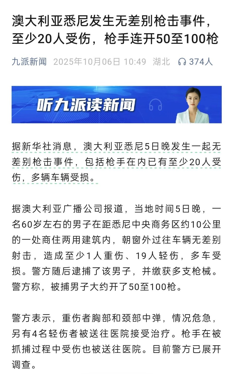 澳大利亚悉尼发生无差别枪击事件,至少20人受伤,枪手连开50至100枪。[哆啦A