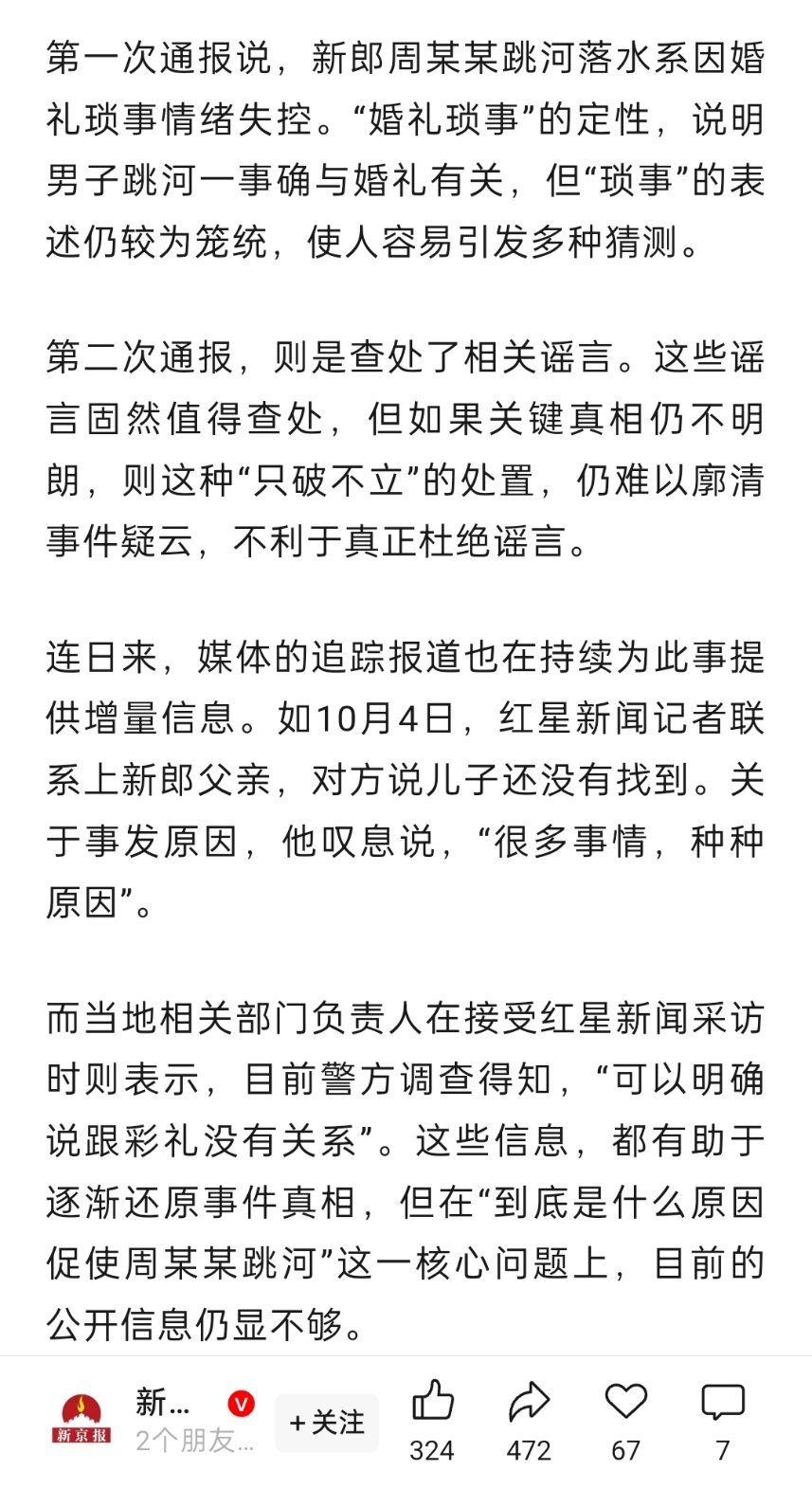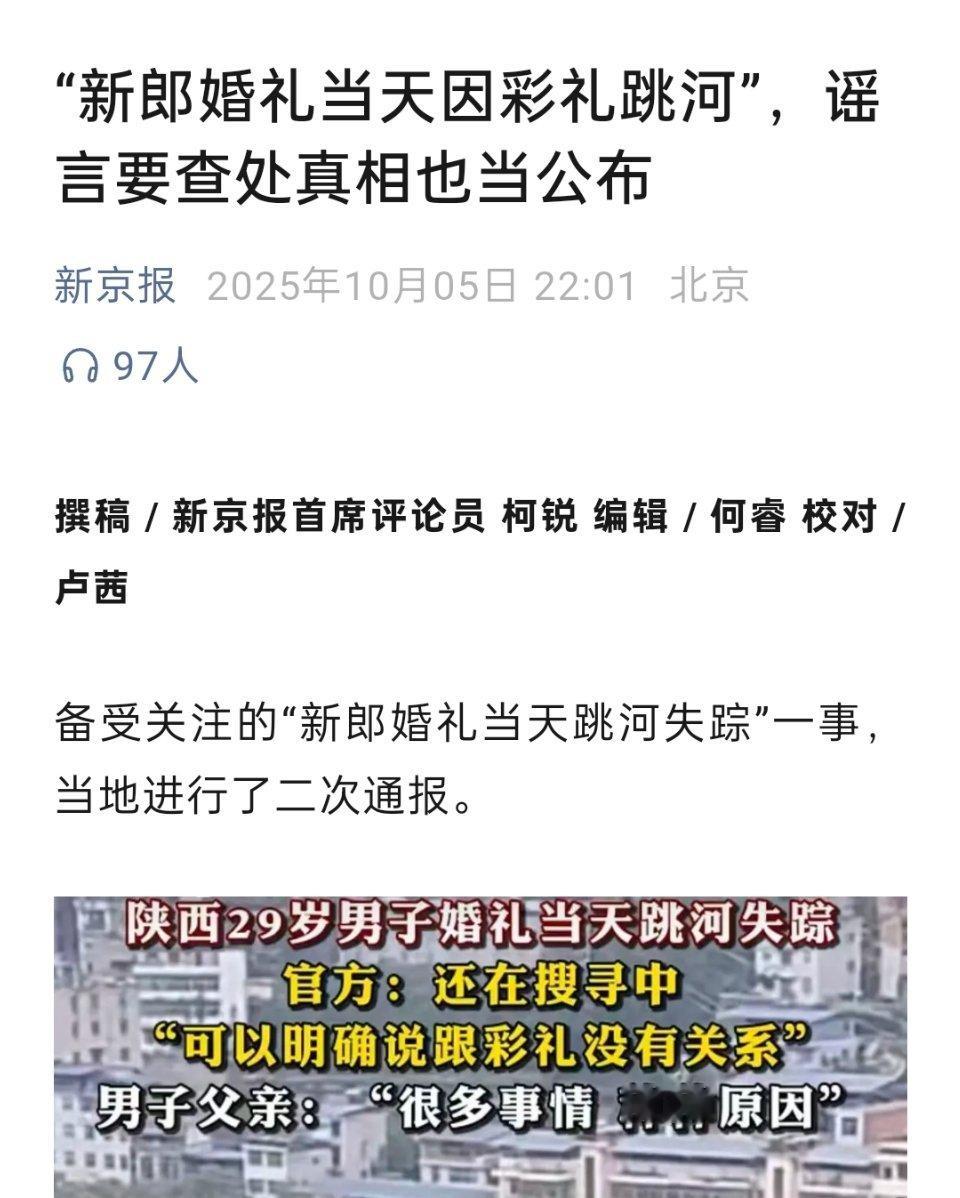 🔻媒体:新郎跳河事件谣言要查处真相当公布。