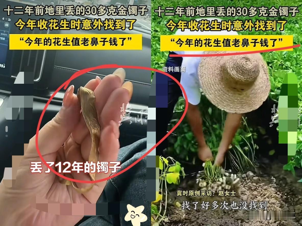河北唐山,女子的姥姥12年前在花生地里丢30多克金镯子。今年收花生时意外找到。女