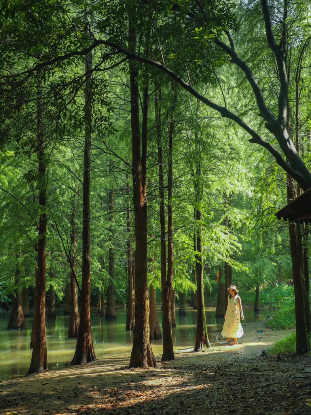 红枫园对面有一片落羽杉林🌲,很适合拍森系照片,湖边有一圈秋千,湖中很多小鸭子,还可以露营野餐,很惬意。