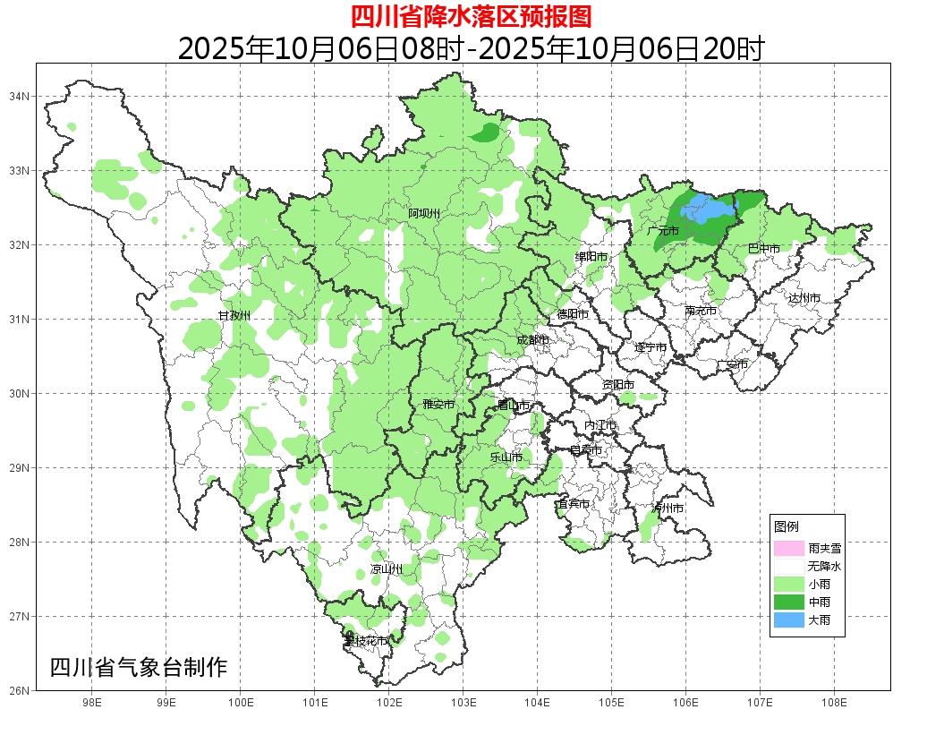 四川省水文水资源勘测中心预测,本周(10月6日–12日),嘉陵江、渠江、涪江可能出现小幅涨水过程,但发生超警戒水位洪水的可能性小;广元、巴中、南充、达州、广安、遂宁等地部分中小河流可能出现明显涨水过程,发生超警戒水位的洪水可能性较小。