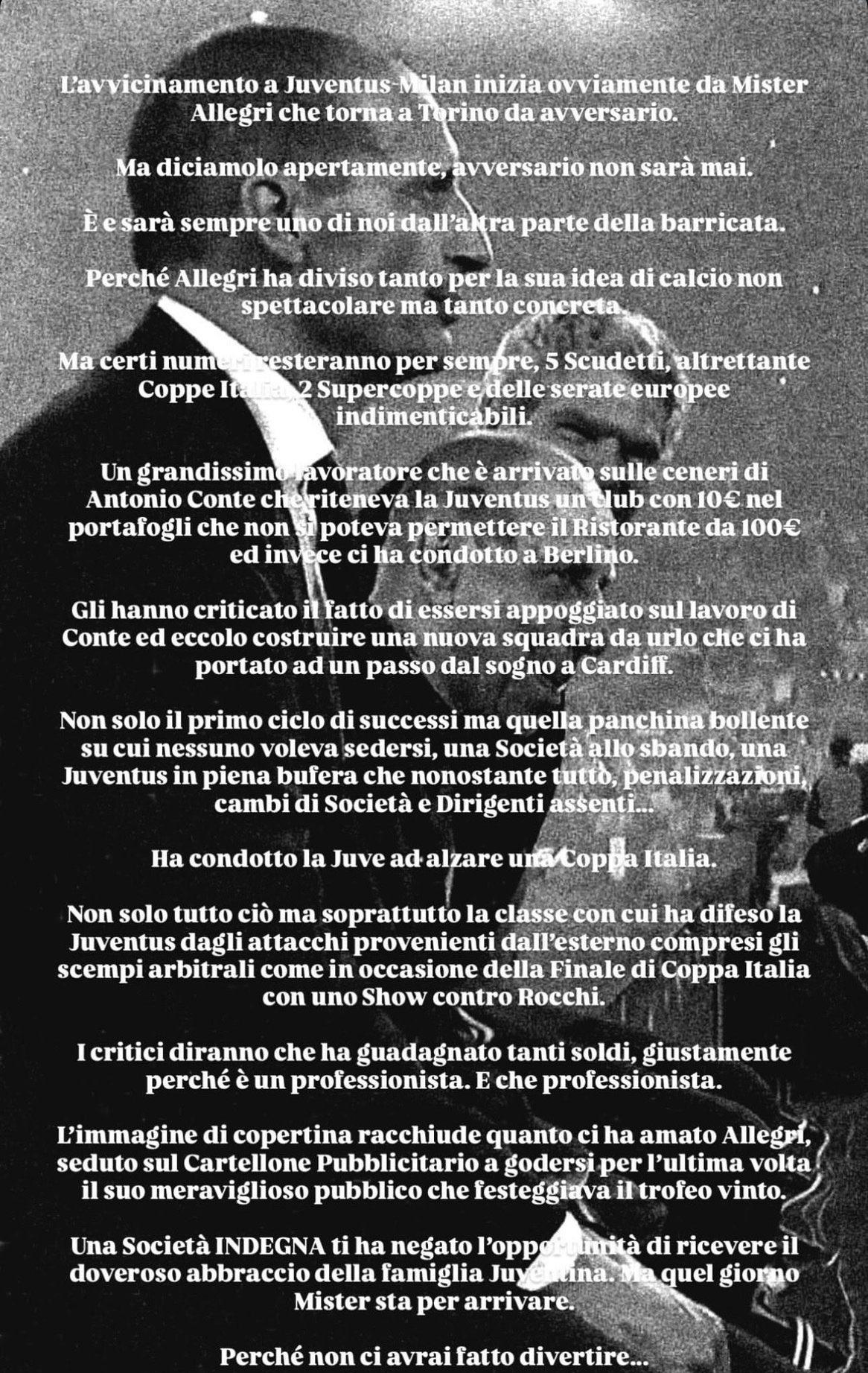 【这段话是否说出了你的心声?】尤文图斯南看台球迷组织长文寄语阿莱格里: “尤文图斯对阵AC米兰的比赛主角显然是阿莱格里先生,他以对手的身份重返都灵。但坦白说,他永远不会真正成为对手。他永远是我们中的一员,即使他现在身处另一边。 阿莱格里的足球理念引发了如此多的争议——并非总是惊艳,但始终扎实。某些数字已名垂青史:5个联赛冠军、5个意大利杯冠军、2个超级杯冠军,以及令人难忘的2次欧冠决赛之夜。 在孔蒂眼中,尤文图斯是一家口袋里只有10欧元的俱乐部,连100欧元的餐厅都负担不起。然而,阿莱格里却带领我们一路来到柏林。他曾因依赖孔蒂的班底而受到质疑,但他打造了一支全新的、强大的球队,带领我们距离在卡迪夫城的梦想仅一步之遥。 他不仅成就了尤文图斯的第一个辉煌,更在俱乐部一片混乱、身陷风暴的时期,毅然决然的选择来到了那个无人问津的“滚烫”教练席。尽管经历了种种磨难——处罚、管理层更迭——他仍然坚持了下来。 他带领尤文图斯再次捧起意大利杯。不仅如此,他还展现出非凡的领导力,抵御了外界的攻击,包括意大利杯决赛中的裁判丑闻以及与罗基的那场令人难忘的硬刚对决。 酸葡萄们会说他赚了很多钱——这理所当然,因为他是一名职业教练。而且,他真的是一位职业教练。 图片概括了阿莱格里对我们的爱,他坐在广告牌上,与他热情的球迷们一起庆祝夺冠,享受着他人生中的上一座奖杯。 一家不值得的俱乐部剥夺了他获得尤文图斯大家庭拥抱的机会。但这位“先生”回归的那一天很快就会到来。因为,即使您并不总是给我们带来欢乐…… 但实际是,先生,您给了我们太多欢乐!!! 欢迎回家,马西米利亚诺·阿莱格里……”