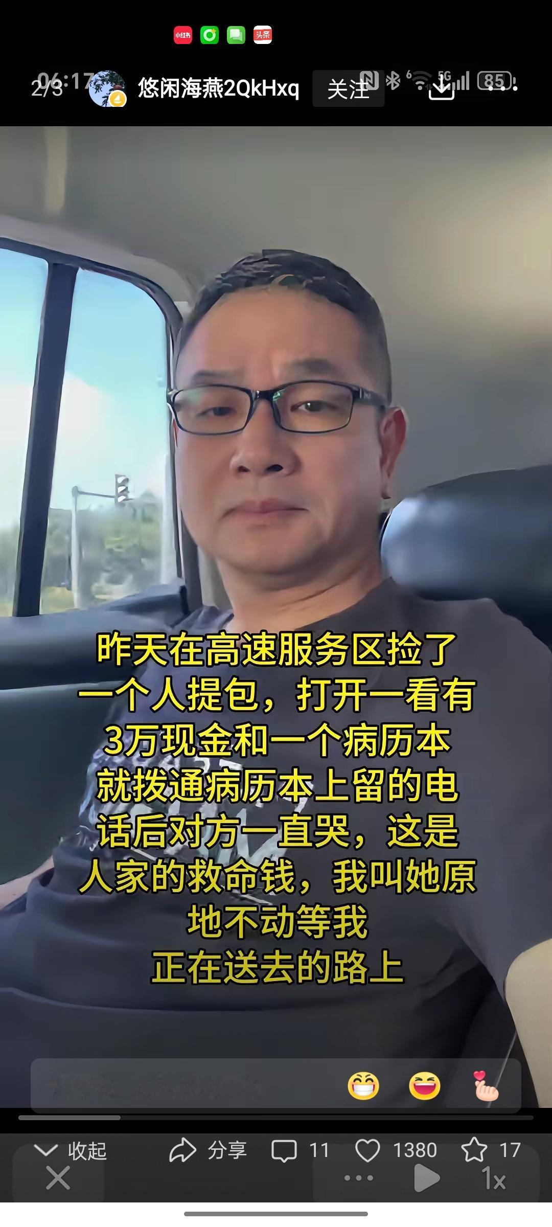 昨天刷到一个视频,真的被暖到了。 在高速服务区,一位帅大叔捡到一个提包,里面有3万元现金和一本病历本。他立刻拨通病历上的电话,得知这是救命钱后,马上让失主原地等待,自己亲自送过去。 这不是简单的拾金不昧,而是对生命的敬畏。在金钱面前,他选择了善良;在方便与麻烦之间,他选择了担当。这种行为,不仅救了一个人,更拯救了一个濒临崩溃的家庭。 最打动我的是,他的善良不带任何功利色彩。没有摆拍,没有索要回报,只是出于本能去帮助需要的人。这种发自内心的善意,比任何华丽的辞藻都更有力量。 在这个快节奏的社会,我们需要更多这样的“帅大叔”。一个善举看似微小,却能温暖整个社会。你身边有没有这样的暖心故事?来分享一下,让更多人相信善良的力量。