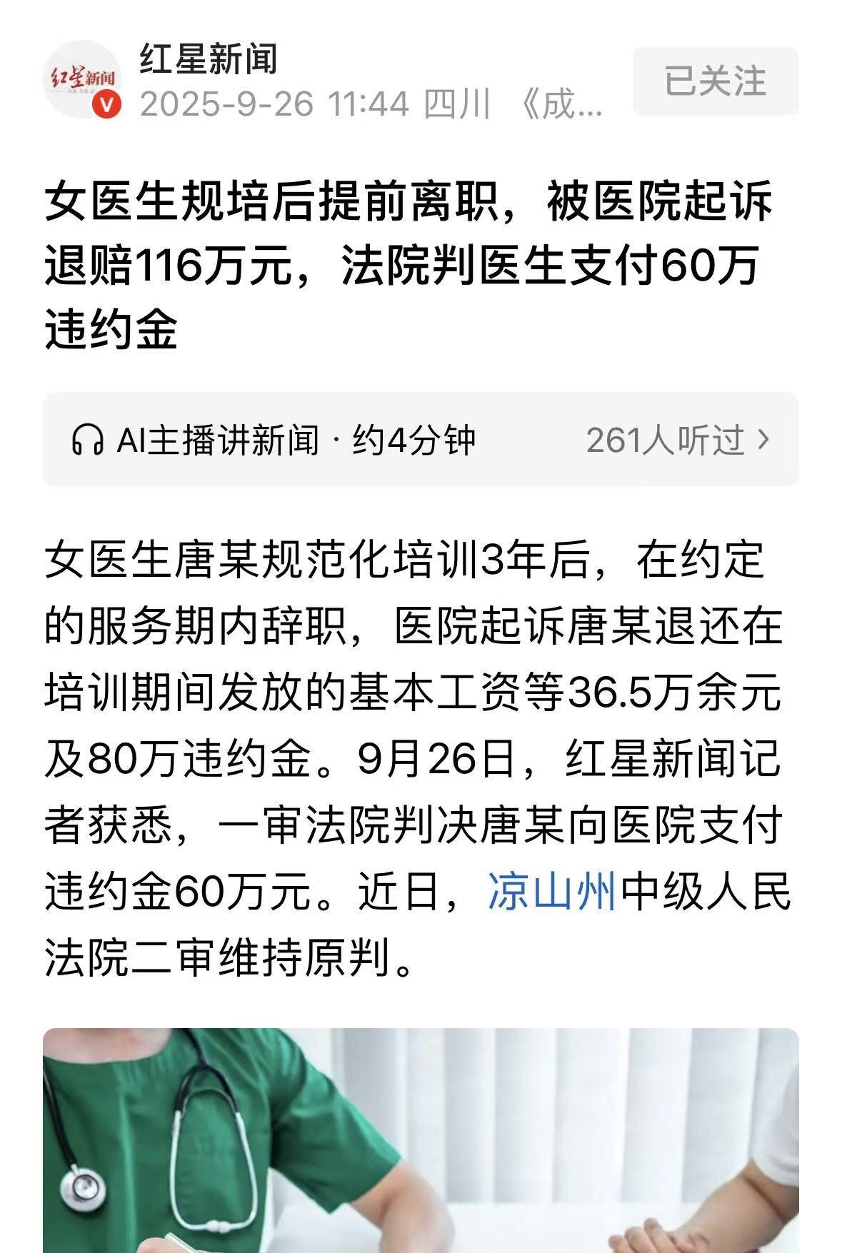 “现代版东郭先生和狼!”四川凉山,一女医生被医院送去深造3年,双方有言在先,女医生结束学业后必须在医院工作8年,这3年,医院会给女医生发放36.5万多元工资,如果女医生跳槽,不但要退还工资,还要赔偿80万,可万万没想到,女医生深造结束第7天就辞职另谋高就,医院愤怒的把女医生告上法庭,案子经过2审,法院最终的判决出乎意料。 2020年,对于唐女士来说,是职场生涯的转折点,她作为医生,因工作能力出色,被医院器重,决定把她送去深造3年,将来作为医院的中流砥柱。 当然了,医院怕唐女士学成归来,翅膀硬了另谋高就去了,那医院的一番心血就付之东流了。 为了防止这种情况发生,医院决定用一纸合同约束唐女士,双方有言在先,在唐女士深造的3年,医院会按时发放每月工资,累计36.5万多元。 但如果唐女士违约,不但要把36.5万多工资退回,还要赔偿80万违约金。 为了抓住难得的提升自己的机会,唐女士信誓旦旦承诺,不会辜负医院的栽培和厚望,等学成归来,一定用3年所学,尽心尽力的工作,绝不做过河拆桥,忘恩负义的是。 可万万没想到,唐女士最终言而无信,违背了合同,竟然在深造结束的第七天,就提交辞职信,准备人往高处走。 医院勃然大怒,认为唐女士背信弃义,没有契约精神,既然这样,那就不客气了,辞职可以,把36万多工资退回,再赔偿80万违约金,共计116万。然后双方一拍两散,各奔东西。 唐女士当然不愿意,医院一纸诉状把唐女士告上法庭,双方对簿公堂。 不想被拴住那就不要接受人家的培养计划啊!接受了培养计划,还想自主去留,那就接受法律制裁呗! 关键是这个医生这样的人,医院一个培训的名额,你想想如果他不违约的话,医院损失不大,他违约的话,医院损失可不是简简单单36.5万的事儿了。 孰是孰非每个人心里都有一杆秤,立场不同观点就会不同,但是做人最重要的是契约精神,诚信最重要! 没有医院给出的机会,唐女士能去规培吗?如果换成别人去外学习,唐某还不是老老实实呆在医院里,能有更好的平台?所以,从某种形式上讲,唐女士学成回归就辞职,不但是违约,而且应视为旷工三年,并骗取了医院三年的工资劳保福利,因此,唐女士应负全责! 人无诚信不立!有了下家就忘恩负义的人走到哪里都不受欢迎!这种人的人品极差,差到没有底线,应该拉入行业的黑名单,让她以后无法从事任何类型的医疗行业。 唐女士跟医院签的协议,说白了就是卖身契,不管你深造回来医院给你开的福利在不好,你也得在那里工作几年的,深造回来工作七天就辞职,说明医院给她的福利不行,如果福利好谁还会辞职,就是医院给她挖的坑。 这就是契约精神,在签字之前就要全面考虑得失,这位医生获得了知识和能力,损失了钱和信誉。 该医生外出培训后,认为自己医技大为提高,原医院已经不适合自己,选择辞职。许多人认为理解,但不要忘记谁给你今天的本事?如果当年没有原单位的有意培训,她不会有今天的本事,更不会有医院愿意要她。所以许多企业不愿意派人外出培训就是这个问题。 那么,法院会如何判决呢? 《劳动合同法》第22条规定:用人单位为劳动者提供专项培训费用,对其进行专业技术培训的,可以与该劳动者订立协议,约定服务期。劳动者违反服务期约定的,应当按照约定向用人单位支付违约金。违约金的数额不得超过用人单位提供的培训费用。用人单位要求劳动者支付的违约金不得超过服务期尚未履行部分所应分摊的培训费用。 唐女士与医院签订的“深造3年+服务8年”协议符合《劳动合同法》。 医院为唐女士提供的是专业技术培训,并承担了36.5万元工资,因此双方服务期约定合法有效。 2. 违约金合法性限制: 原合同约定“退还36.5万元工资+赔偿80万元违约金”,总金额116万元,但最终法院最终仅支持60万元违约金。 这是因为《劳动合同法》第22条明确要求违约金不得超过实际培训费用。 本案中,法院可能认定医院主张的“36.5万元工资”属于劳动报酬而非专项培训费用,故仅支持实际培训成本的合理比例,如60万元。 《劳动合同法》第25条规定:除本法第22条,专项培训违约金,和第23条保密义务违约金规定的情形外,用人单位不得与劳动者约定由劳动者承担违约金。 医院的“退还工资+赔偿80万元”约定存在法律瑕疵。根据第25条,用人单位仅在专项培训和保密义务两种情形下可与劳动者约定违约金,不得单方增设其他违约责任。 法院依据《最高人民法院关于审理劳动争议案件适用法律问题的解释(一)》第4条,认为违约金数额需与培训成本相当,故将80万元酌情调整为60万元。 关注@灋律盐究员 学法辩是非,用法止纷争。