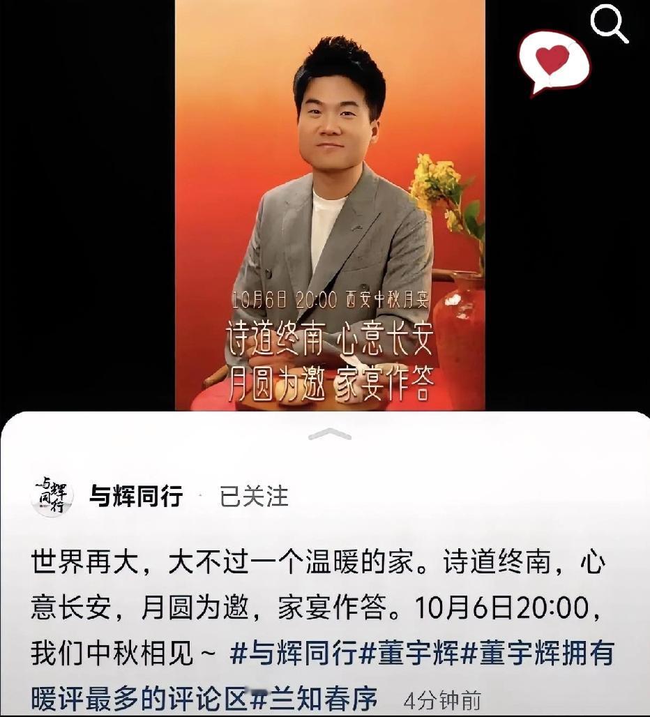董宇辉的中秋月宴——不止是个活动! 西安市委宣传部、市文旅局、长安区委宣传部、长安区文旅局联合出品的中秋盛典,通过董宇辉的流量带,让更多人认识“长安”文化! 这不是一般的带货直播,这是文化,这是一场让大家重新认识终南山、盛唐的文化盛宴! 这是一次传播,也是一次心动,这是一次带货,更是一次点亮,让我们看到赚钱也可以为了点亮一座城市,一段历史,一个故事。 让我们看到大咖也可以为了推广自己的热爱,让大家去热爱他的热爱,让我们看到大咖也可以为了推广自己的热爱,让大家去热爱他的热爱! 这让我们看到,做文化,做推广,可以这样温暖! 佩服董宇辉!