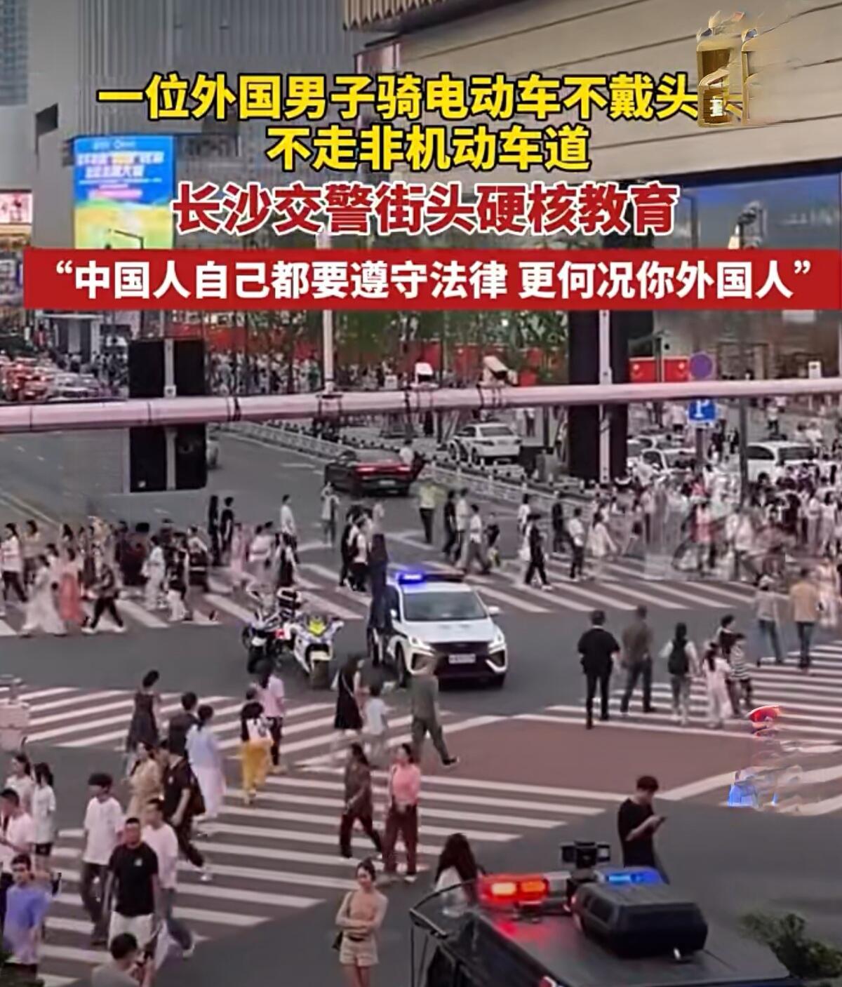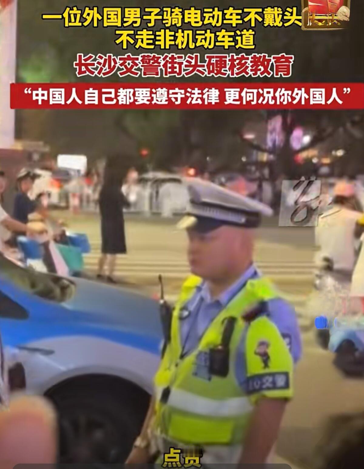 这事儿发生在长沙五一广场。10月4号下午,一个外国哥们儿骑着电动车蹿到机动车道上,还没戴头盔,被执勤的交警李峰给拦下来了。 结果你猜怎么着?这老外一张嘴就是“我是外国人,不懂你们这儿规矩”,一边说还一边偷偷拧电门想溜。李峰一把按住车把,执法记录仪怼着脸拍,直接甩出《道路交通安全法》两条规定:骑电动车必须戴头盔,非机动车不能上机动车道——管你哪国人,在中国地盘上就得守中国法律。 见耍赖不行,老外又掏出手机拍交警证件,嚷嚷要投诉。李峰压根没在怕的,当场切换英语,连手机里存的法律条文截图都亮出来了,话说得明明白白:“在中国,守法是每个人的义务,没有例外。” 全程就用了八分钟,罚单开出来,字也签了。围观群众拍视频发上网,网友齐刷刷点赞:“这才叫法律面前人人平等!” 要我说,长沙交警这波操作确实硬气。数据摆在那儿,今年前三个季度已经处理了127起外籍人员交通违法,全是按统一标准来的。法律专家也说了,根据属地管辖原则,只要在中国境内,谁都不能搞特殊。 李峰事后那句话特别在理:处罚是手段,教育才是目的,但法律红线谁都不能碰。这事儿给所有人都提了个醒——国籍不是护身符,守法才是硬道理。