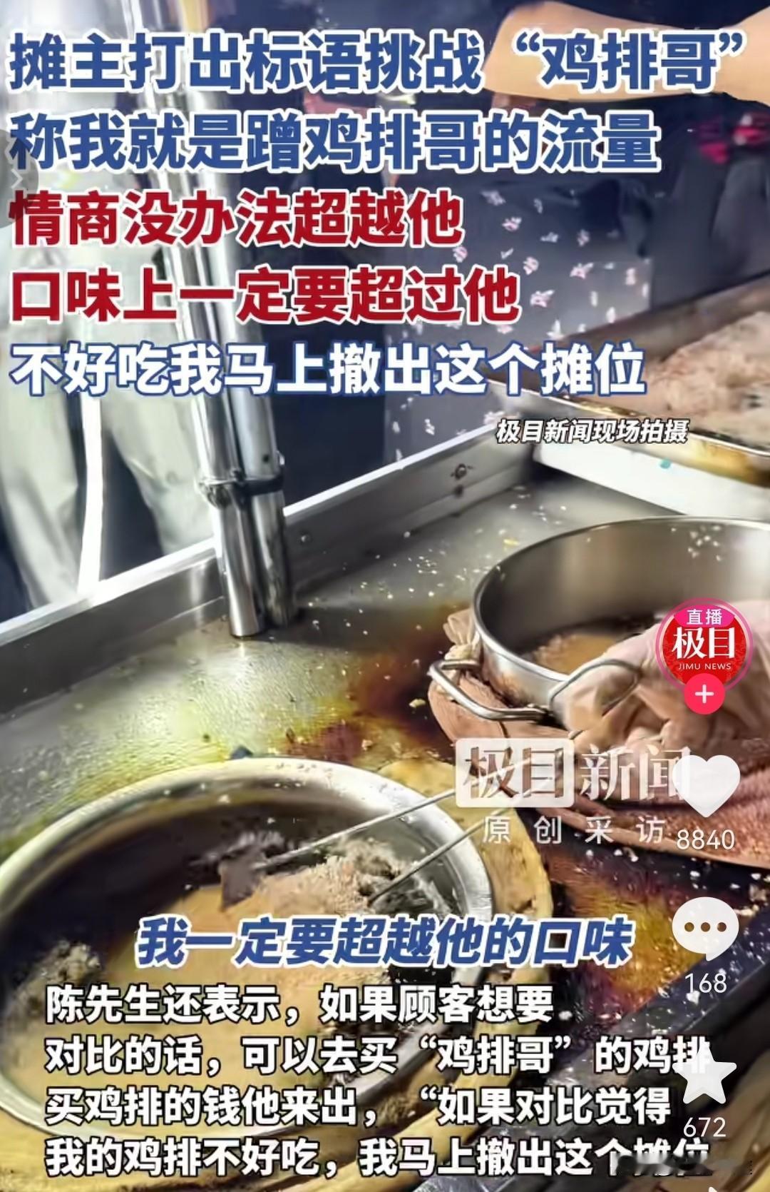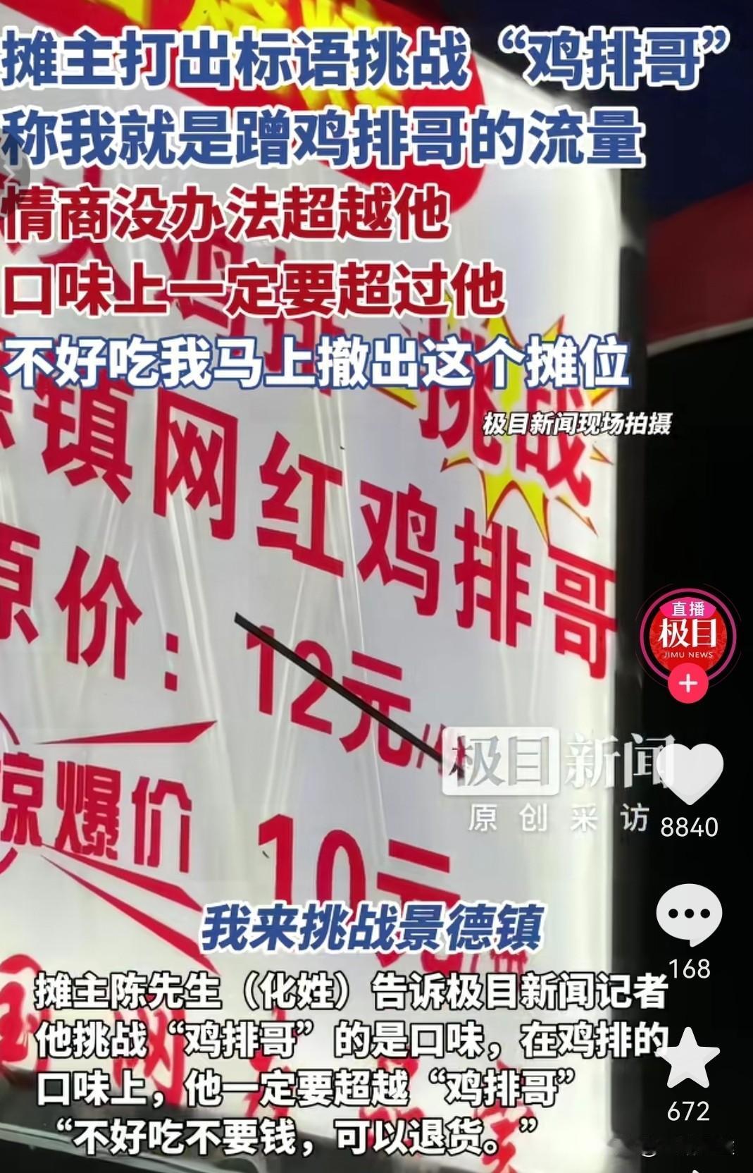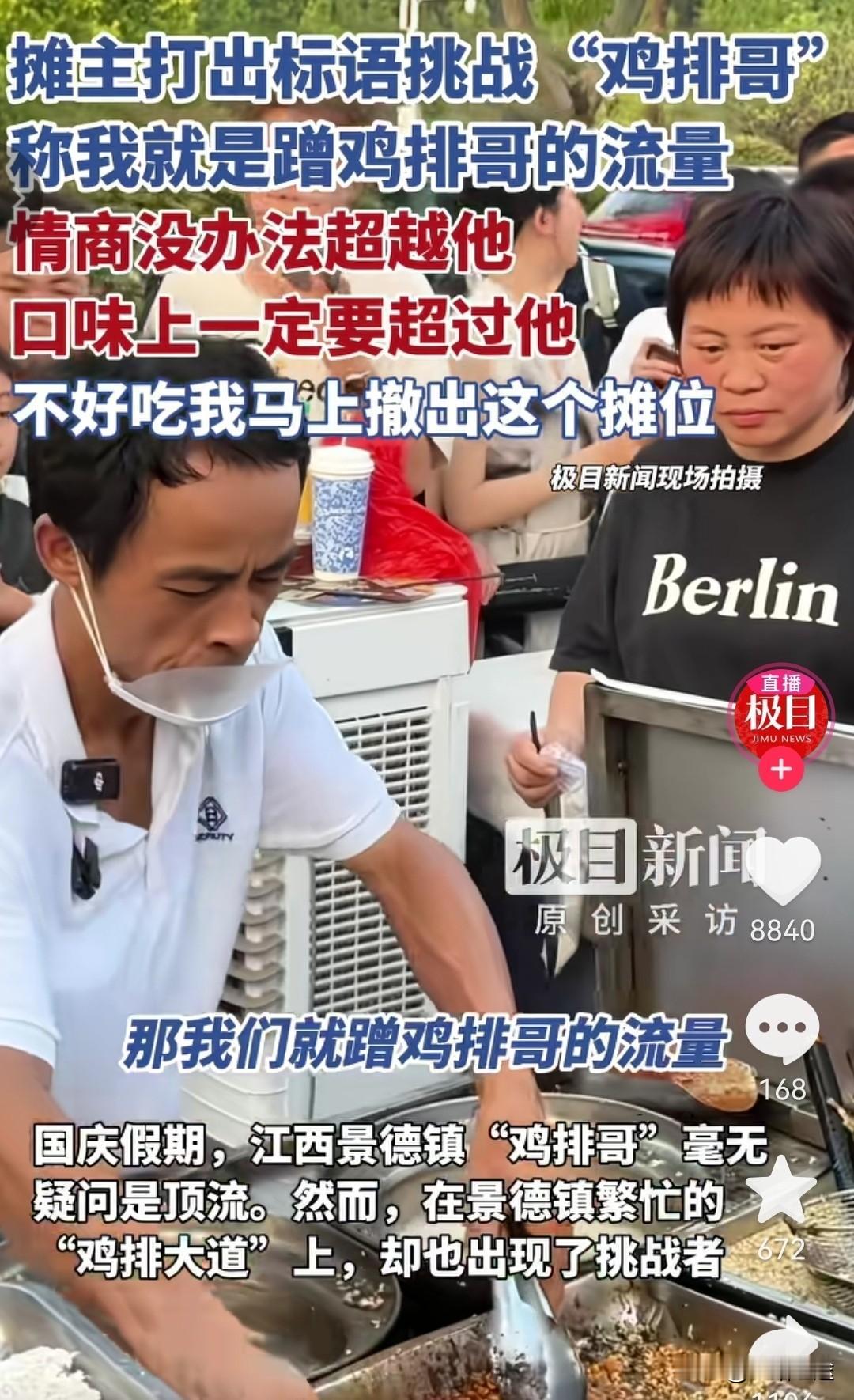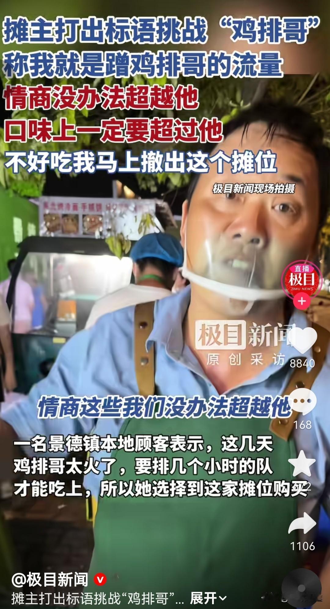 [捂脸][捂脸]最近景德镇鸡排哥的热度只上不下,这些人压根就不是冲鸡排来的,只是为了鸡排哥提供的情绪价值跟听听经典语录而已,你却来挑战鸡排味道,说实话鸡排的味道几乎都差不多的,而且你卖的价格比鸡排哥还贵4块,这不摆明蹭热度刷存在感吗?别把自己搞网暴就行! 鸡排哥 景德镇鸡排哥