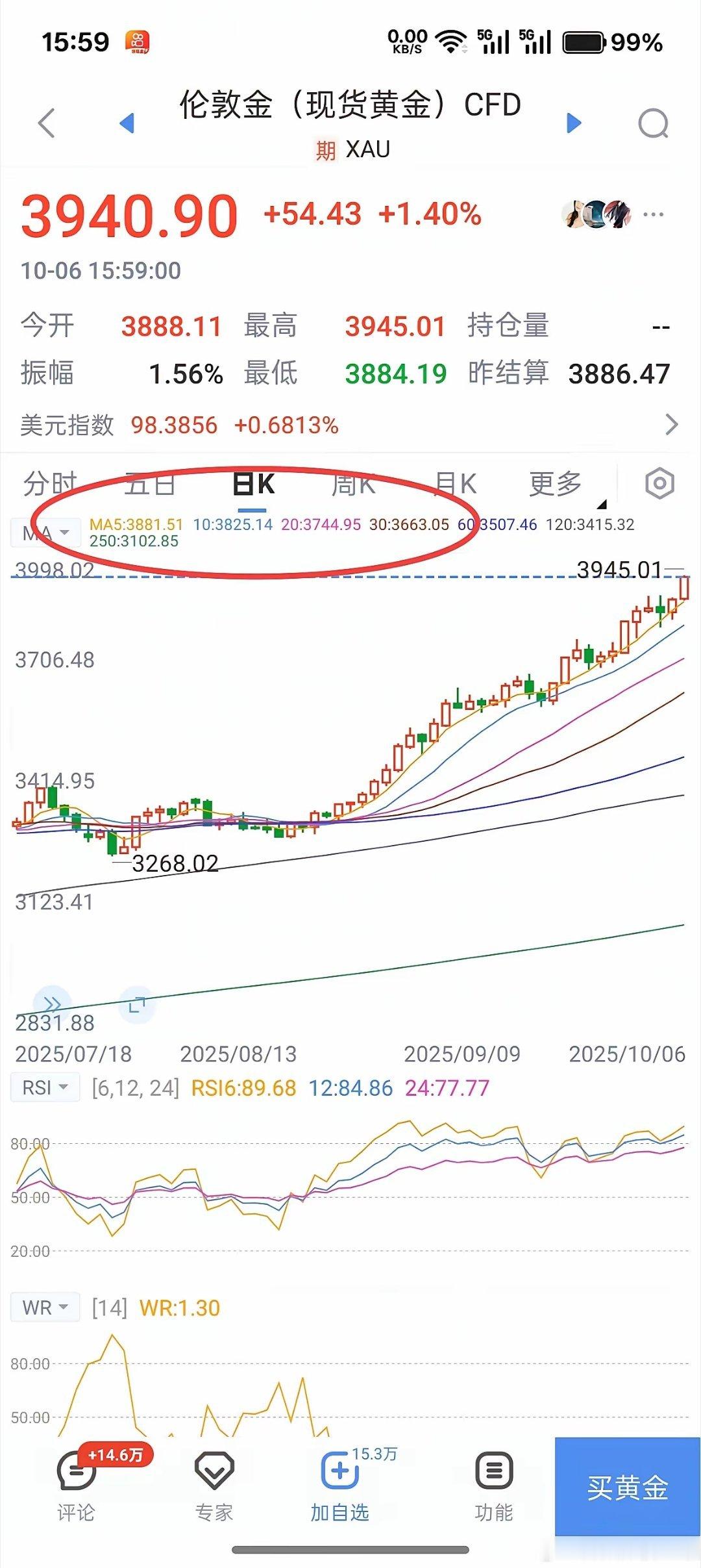 ​特别是现货黄金,已经突破3900,离4000也指日可待,它的走势就是一直沿着五日线上移,最多破一下五日线,到十日线附近就拉起来。