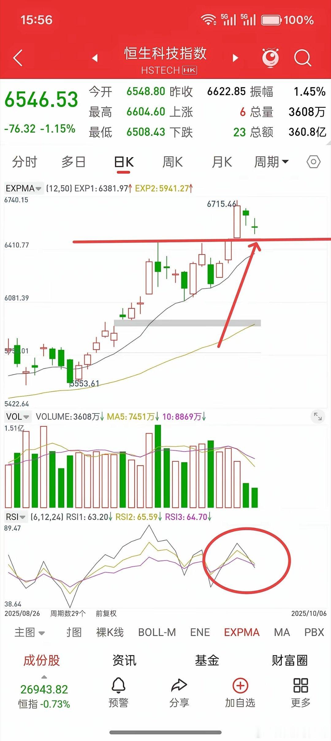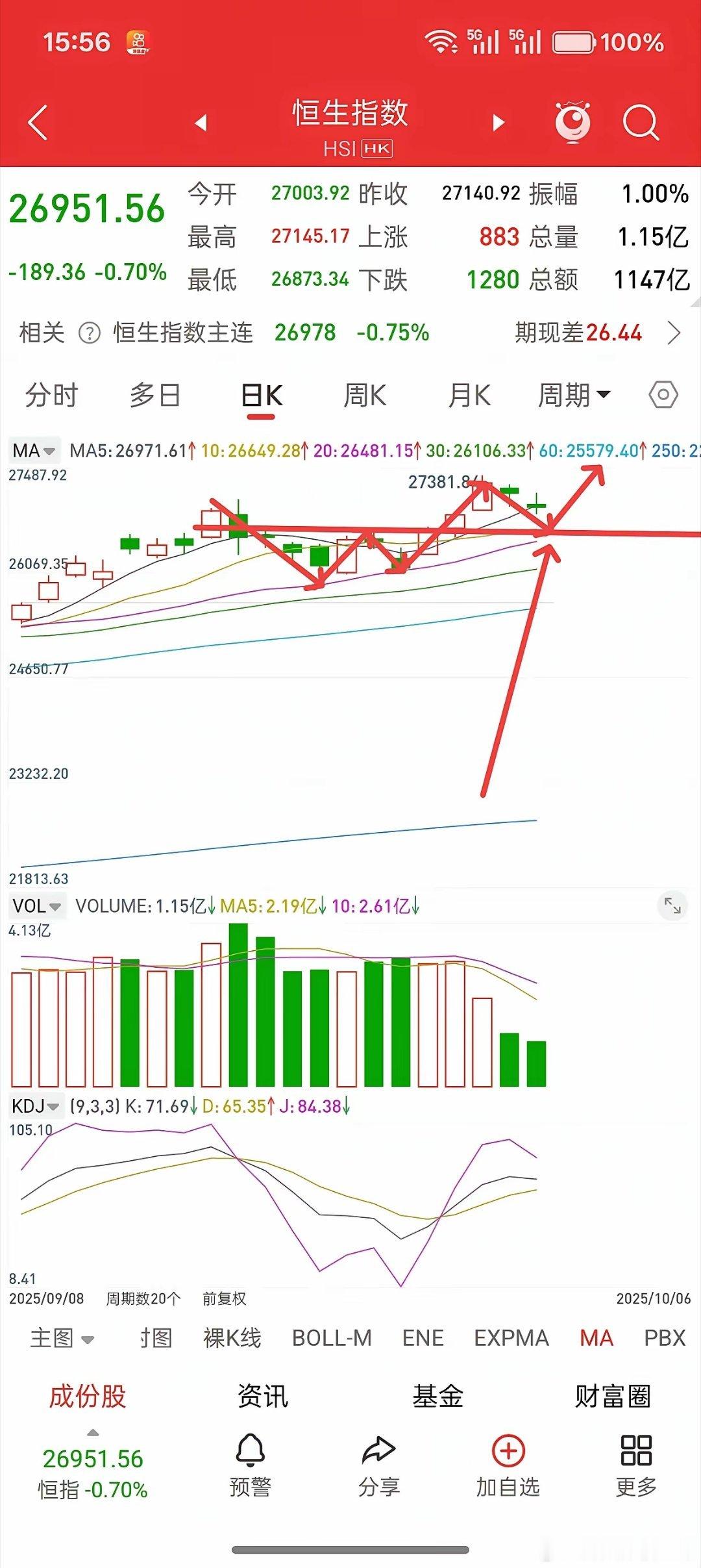 ​港股已经连续两天调整,调整不可怕,怕就怕跌破20日均线,一般来讲,一个板块,还是一只票,如果走势真的强势,它会沿着五日线一直往上运行,盘中即使出现调整也最多到十日线,深一点也就20日均线足矣。后面还会继续往上拉升。