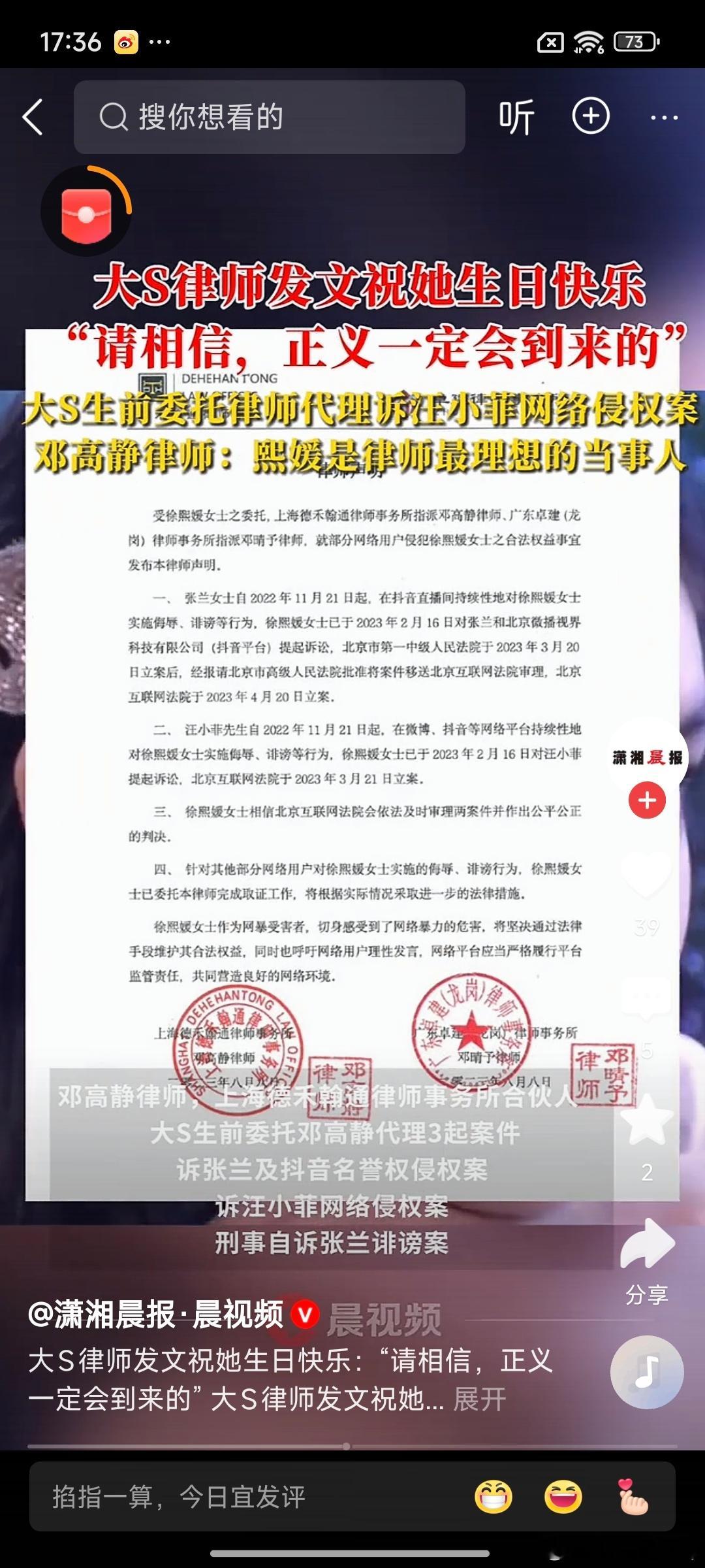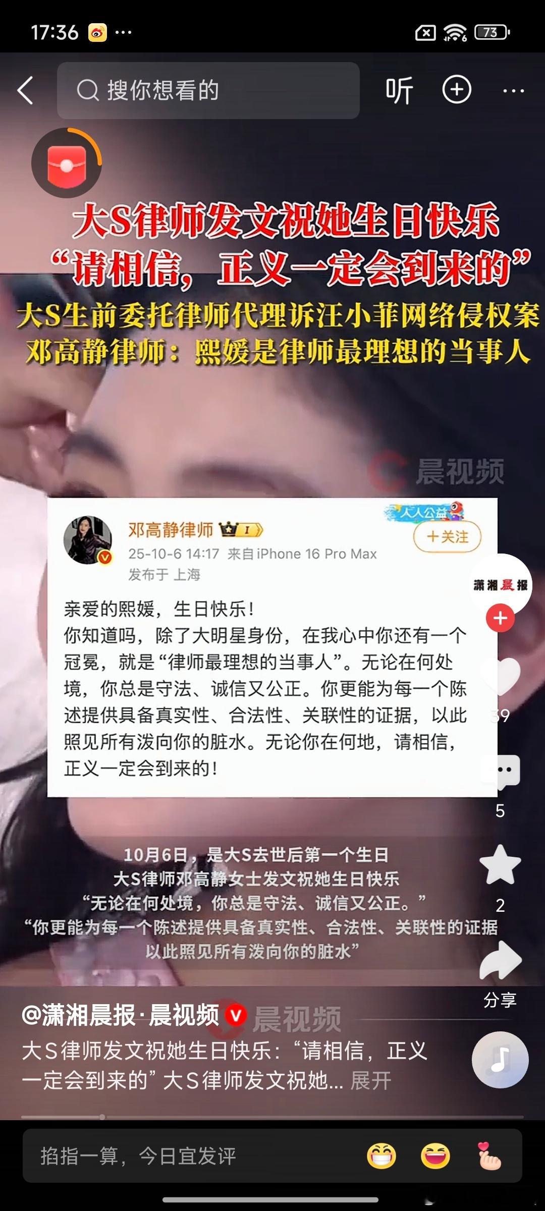 2025年10月6日,曾负责大S诉张兰名誉权侵权等案件的邓高静律师在社交平台发文,称大S除明星身份外,还是“律师最理想的当事人” 。她高度赞誉大S法律素养,称其守法、诚信、公正,能为陈述提供具真实性、合法性、关联性的证据。文末“正义一定会到来”被视为对未尽诉讼的承诺。