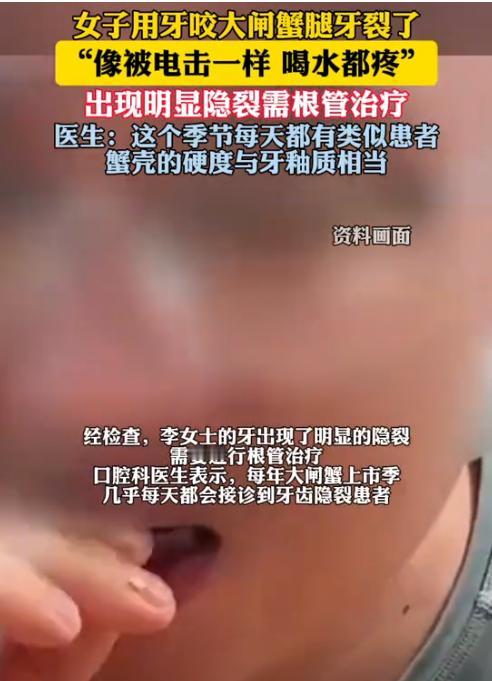担心的事还是发生了!10月2日报道,浙江,一女子趁中秋过节,买了一堆大闸蟹,结果,煮好后刚咬了一口大闸蟹蟹腿,牙齿就传来一阵剧痛,紧接着喝口水都疼,她捂着脸去医院检查:“医生,我吃螃蟹时牙齿突然疼得厉害,像被电击一样!”经过检查,李女士的牙出现了明显的隐裂,需要进行根管治疗。 10月2日澎湃新闻报道,国庆节时,浙江的李女士路过水产市场,看到那些个头肥大的螃蟹就走不动道了,摊主特别会做生意,说她是第一个顾客给打折,李女士心动了买了一大堆回家。 回家后李女士选择了最简单的清蒸做法,螃蟹刚出锅香味扑鼻,她就迫不及待地开吃了,平时很少吃螃蟹的她,根本不懂什么技巧,拿起蟹腿就往嘴里送用牙齿硬咬。 刚开始还挺顺利咬一块吃一块,满屋子都是嘎嘣嘎嘣的声音,可吃了几个之后牙齿开始有点酸痛,但美味当前谁还管那么多,李女士继续大快朵颐。 突然咯噔一声脆响,李女士感觉牙齿像被电击了一样,疼得她捂着嘴直叫唤,丈夫看到她疼成这样,赶紧带她去了医院。 牙科医生检查后发现,李女士的牙齿已经出现裂纹,需要进行根管治疗,医生说螃蟹壳的硬度其实很高,用牙齿硬咬很容易造成牙齿损伤,治疗期间李女士只能吃软食,最好只喝汤水。 其实类似的伤牙行为在生活中很常见,有人用牙开酒瓶,有人喜欢啃冰块、骨头,还有人吃坚果不去壳,更多人把牙齿当剪刀用来撕包装,这些看似小事,实际上都在慢慢损害牙齿健康。 网上有不少人分享了自己的经历,有网友说去年咬蟹腿把牙咬敏感了,后来一吃凉的热的就疼,花了一千多做脱敏治疗,还有人说母亲啃排骨时用牙咬骨头结果牙裂了,根管治疗加补牙花了两千多,还得去医院好几趟。 牙科专家提醒,牙齿虽然是人体最坚硬的组织之一,但并不是无坚不摧的,牙釉质的硬度虽然很高,但脆性也大,遇到硬物撞击很容易出现裂纹或崩裂,一旦出现裂纹细菌就容易侵入,引发各种牙齿疾病。 吃螃蟹的正确方法其实很简单,准备好专用的蟹针、蟹钳等工具,先把蟹腿掰下来用蟹钳夹开关节处,再用蟹针挑出里面的肉,虽然看起来麻烦一点,但既能完整地吃到蟹肉,又不会伤害牙齿。 现在根管治疗的费用可不便宜,少则几百多则上千,而且治疗过程需要多次就诊,每次都要忍受钻牙的痛苦,治疗期间还要忌口,很多美食都吃不了,相比之下花几分钟用工具吃螃蟹,实在是太划算了。 其实这些事故都是因为图省事惹的麻烦,生活中很多小细节都值得注意,比如开酒瓶用开瓶器,吃坚果先剥壳,撕包装用剪刀,这些看似繁琐的步骤,其实都是在保护我们的健康。 牙齿一旦受损影响的不仅是吃东西,还会影响说话、外观,甚至引发其他健康问题,与其事后花大价钱治疗,不如平时多加小心,毕竟牙齿可不像头发指甲,坏了就没法再长出来了。 下次吃螃蟹的时候记得准备好工具,别再让牙齿硬碰硬了,美食虽好健康更重要。 麻烦看官老爷们右上角点击一下“关注”,既方便您进行讨论和分享,又能给您带来不一样的参与感,感谢您的支持!