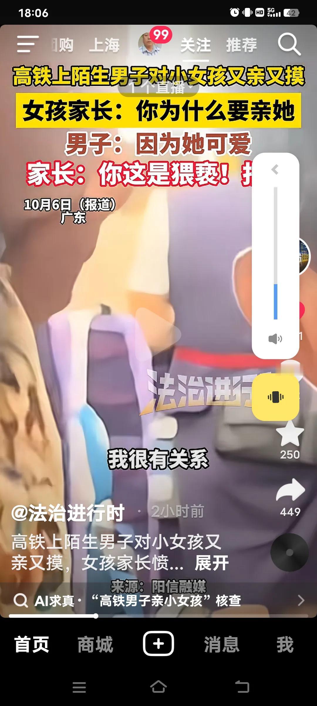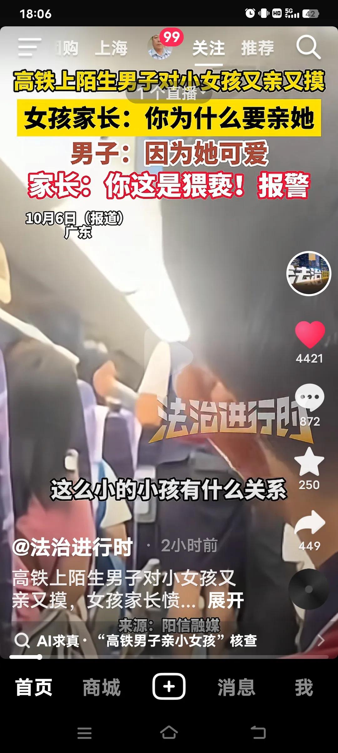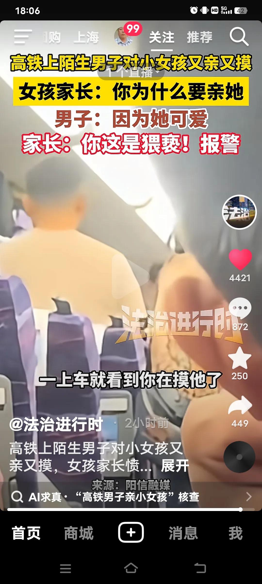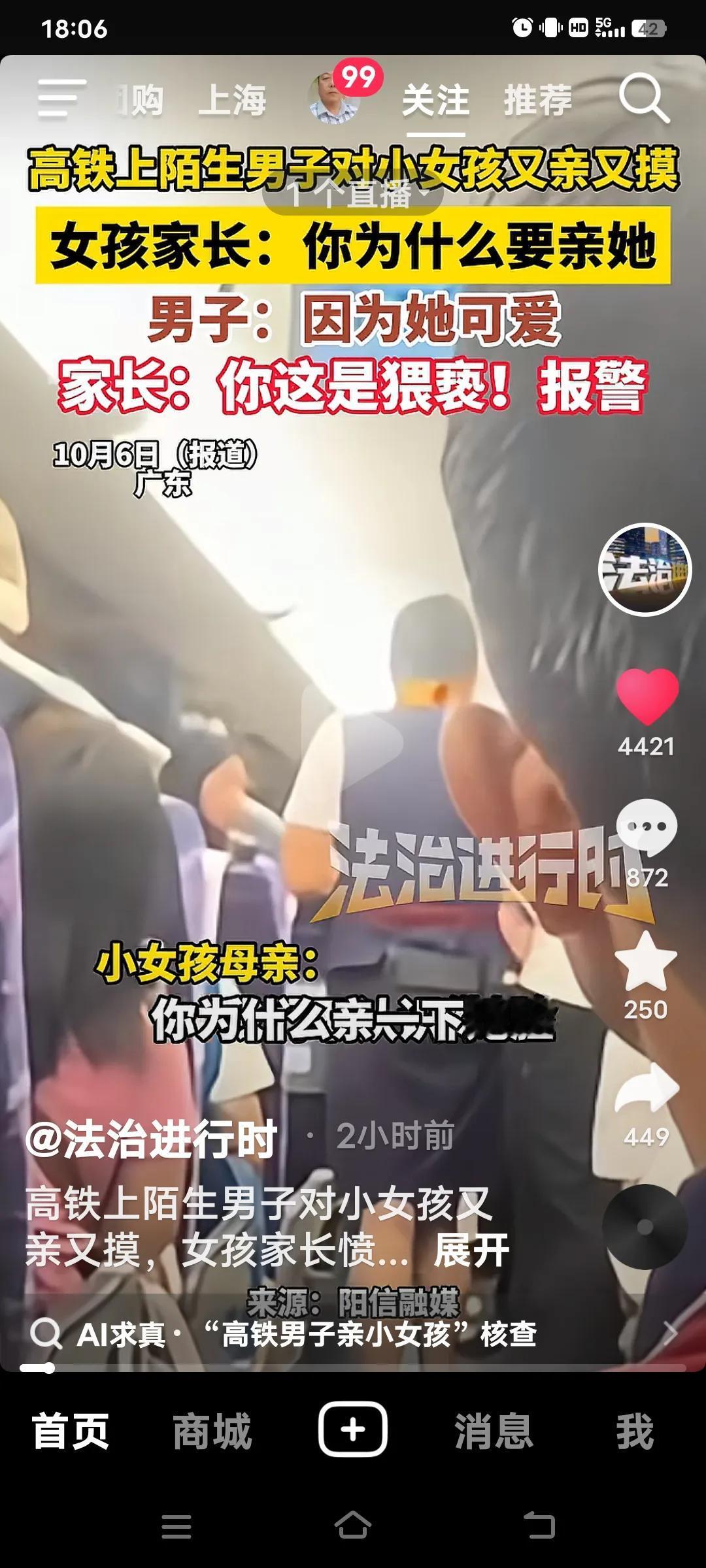 高铁上陌生男子对小女孩又亲又摸,家长愤而报警! 10月6日,广东有报道称,高铁上一名陌生男子一上车就对小女孩又亲又摸。小女孩的母亲十分气愤,说道:“我们和你素不相识,你为何要对孩子又亲又摸?”该男子却回应:“她那么可爱又那么小,亲一下摸一下有什么关系?”女孩母亲质问道:“怎么会没关系?我有关系!” 说到底,错全在这名男子。孩子再可爱,也不能亲她的脸、随意抚摸她啊。如果是个男孩子,或许还能有这样的举动,但对于小女孩,摸摸头也就罢了,男孩和女孩是有区别的。谁知道你心里打的什么主意?家长认定这属于猥亵行为,坚决要求交由公安处理! 地铁亲密行为 地铁亲密 动车猥亵 地铁吻
