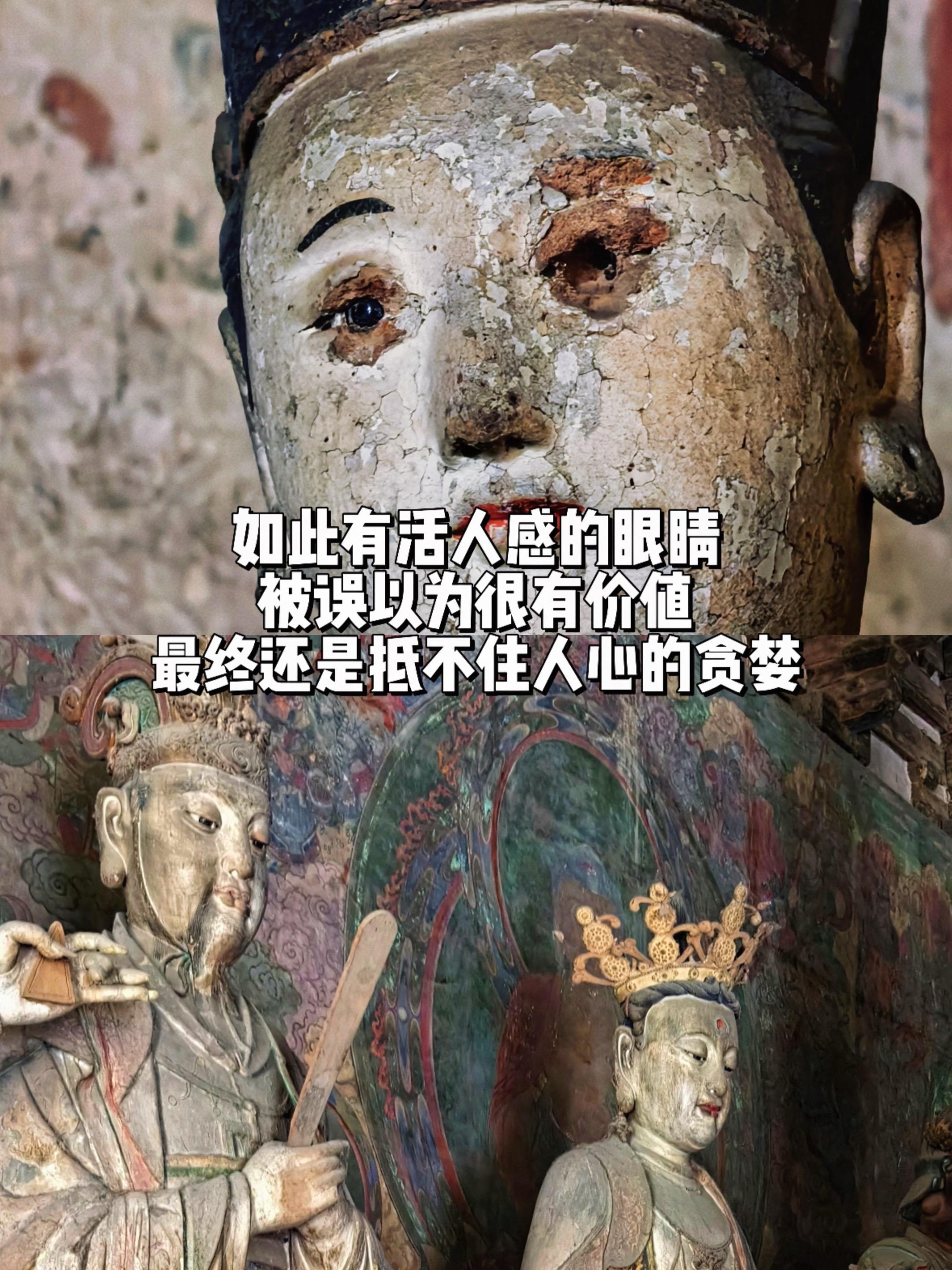 古人会为佛像安装眼睛,让他们能看到人间。云冈石窟佛像眼睛上出现两个大窟窿,身上布满小孔,这些小孔并非故意破坏,而是古人修缮时留下的,表面泥塑脱落后暴露出小孔,但他的眼睛是被后人挖除的,还有大同善化寺的吉祥天女,她额头上的宝石也被挖走,好在眼睛保存完好,塑像的眼睛通常是与众人沟通的窗口,展现出无尽的悲悯,东方塑像讲究神韵,即使在不同的角度,会有被盯着的错觉,这种眼珠有的是琉璃的,也有涂了釉料的陶眼珠,最终还是抵不住人心的贪婪,双林寺泥塑失去一只眼睛后,眼神都忧郁了,真是可惜!