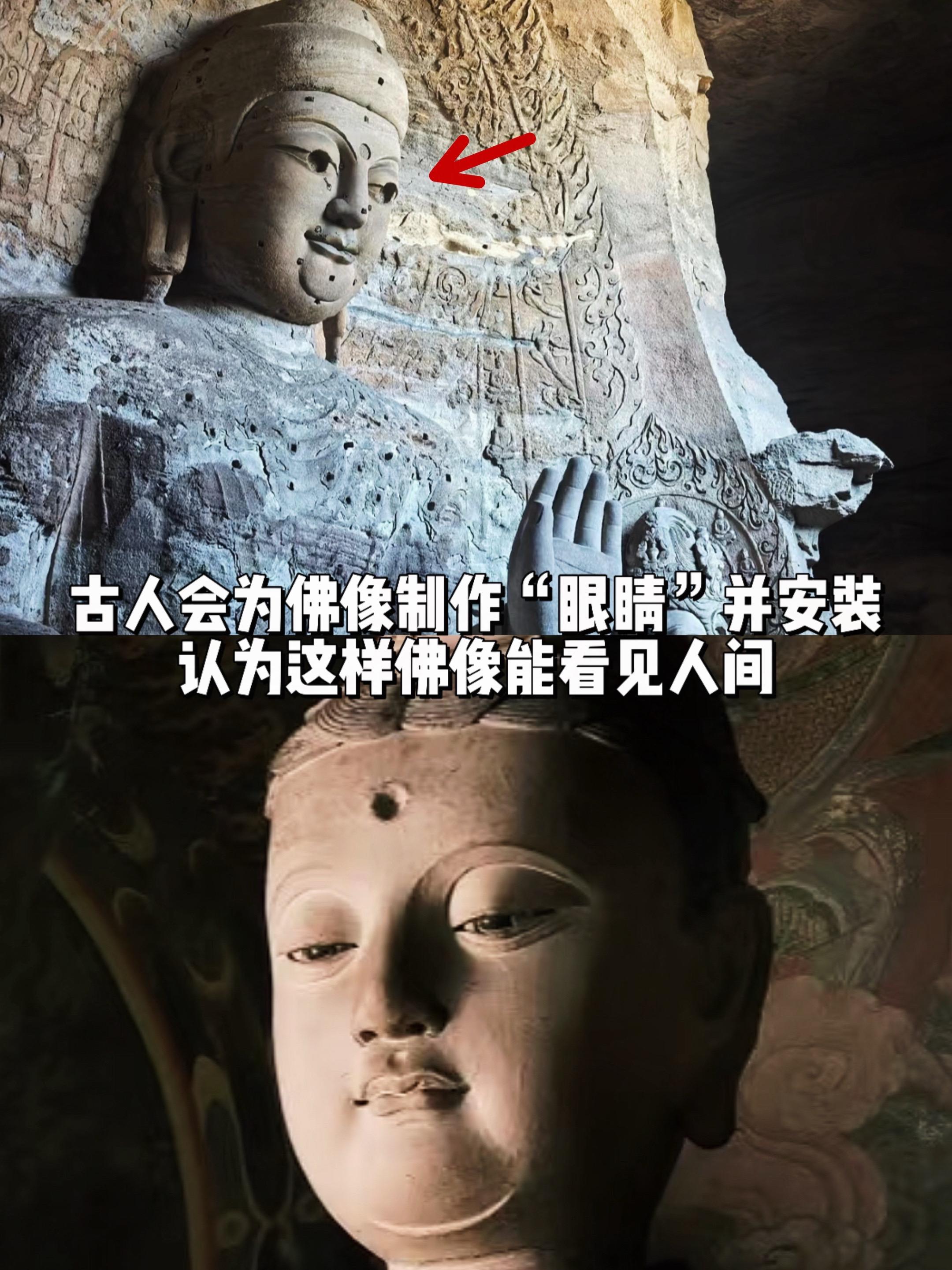 古人会为佛像安装眼睛,让他们能看到人间。云冈石窟佛像眼睛上出现两个大窟...