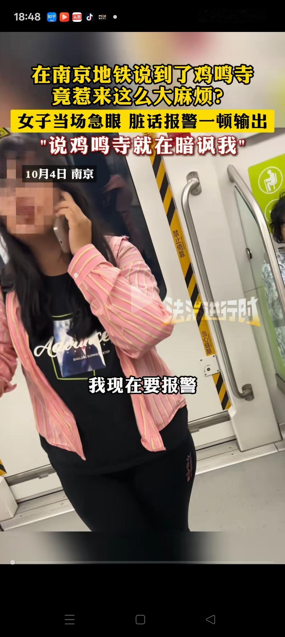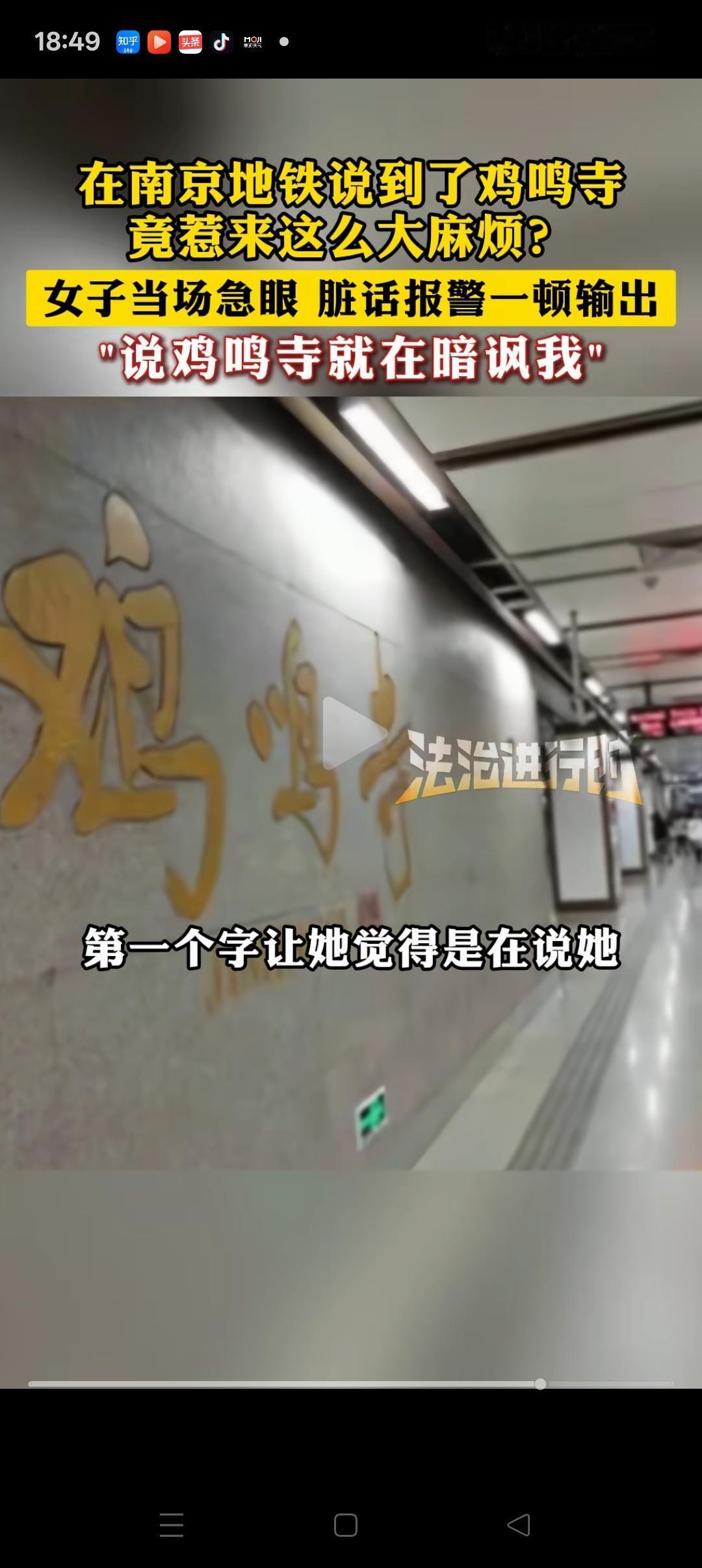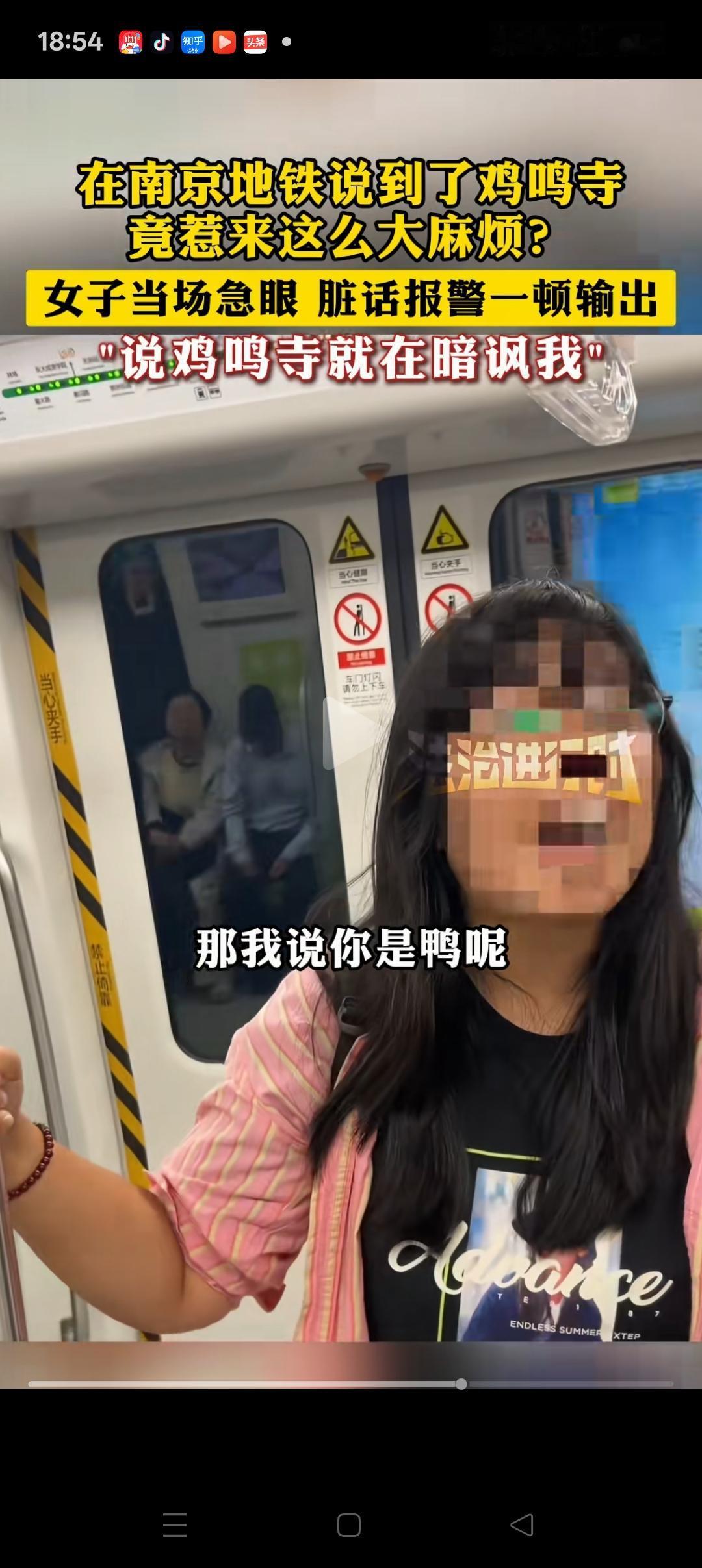 “不是谁闹谁有理”,南京地铁,一男子随口说了句:“鸡鸣寺快到了”。没想到,旁边的小仙女不乐意了,觉得第一个字是在暗讽她,要求道歉,还打电话找帽子叔叔帮忙。 同行的女孩看到男孩吃亏,都忍不住问,鸡鸣寺就是个名字好嘛!女孩很生气,还怼她“那我说他是鸭呢”。 真的是奇怪,鸡鸣寺确实只是个名字,还是地铁站的名字,有什么不能说的,还觉得暗讽你,真的是无理取闹。 那要是按她的逻辑,以后带“鸡”的词都不能在她面前出现,是不是也太离谱了。 不是谁闹谁有理,就这颜值和身材,谁有功夫去说她啊,无聊至极[捂脸][捂脸]。。