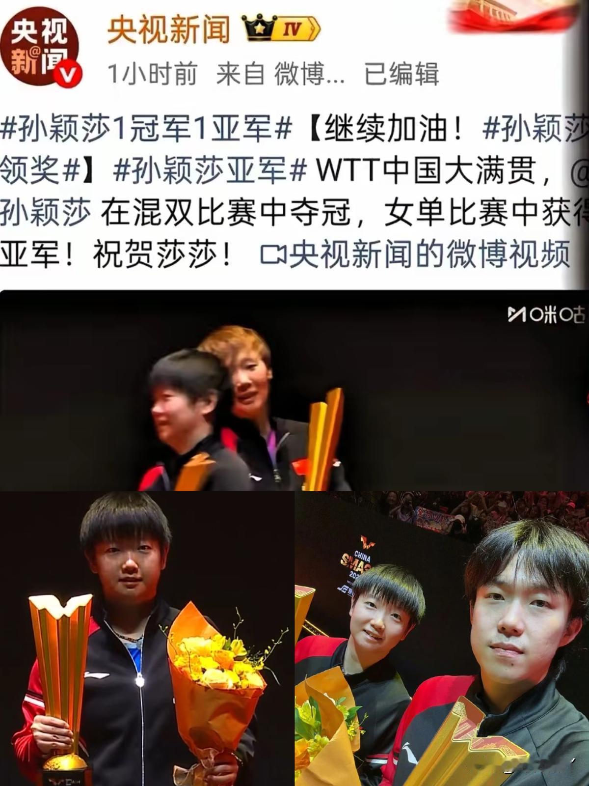 央妈亲自为孙颖莎打call, 本次中国大满贯,她混双稳拿冠军,单打虽憾获亚军,却凭每一分的坚持显顶尖水准,身兼两项双线出彩,官方点赞就是最好的肯定! 混双赛场,“莎头组合”第5次捧起大满贯冠军奖杯。决赛对阵黄友政/陈熠,两人配合默契,最终直落三局锁定胜局,举奖杯时因分量太重双双露出可爱表情包,成了赛场超暖心、敲可爱的小插曲。 单打“莎昱大战”全程高能。孙颖莎第二局11-3强势领跑,即便后续被对手战术压制,仍像对阵王艺迪时那样多次倒地救球,虽最终惜败,却用韧性诠释了顶尖选手的素养。赛后她坦言“不论输赢都是收获”,这份从容更显成长。 输过从不怕输,这才是孙颖莎的魅力。下一站赛场,期待她更精彩的表现! 看完比赛,你对混双夺冠的甜蜜瞬间、还是单打极限救球印象更深?来评论区说说!