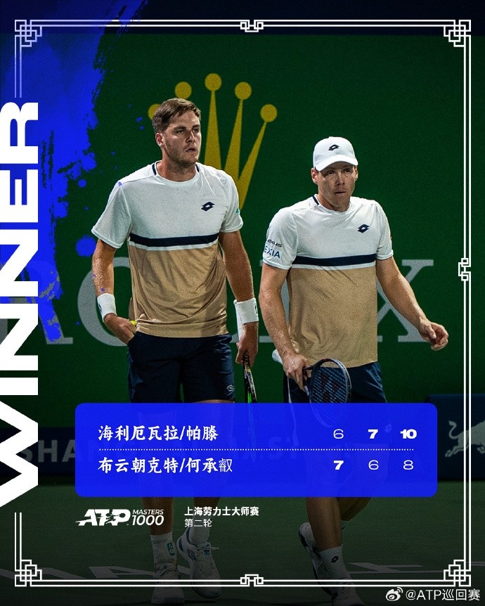 ATP上海大师赛男双第二轮,持外卡出战的布云朝克特/何承叡错失一个赛点,以7-6(3)6-7(4)8-10不敌2号种子、中网冠军海利厄瓦拉/帕滕,遗憾无缘八强。