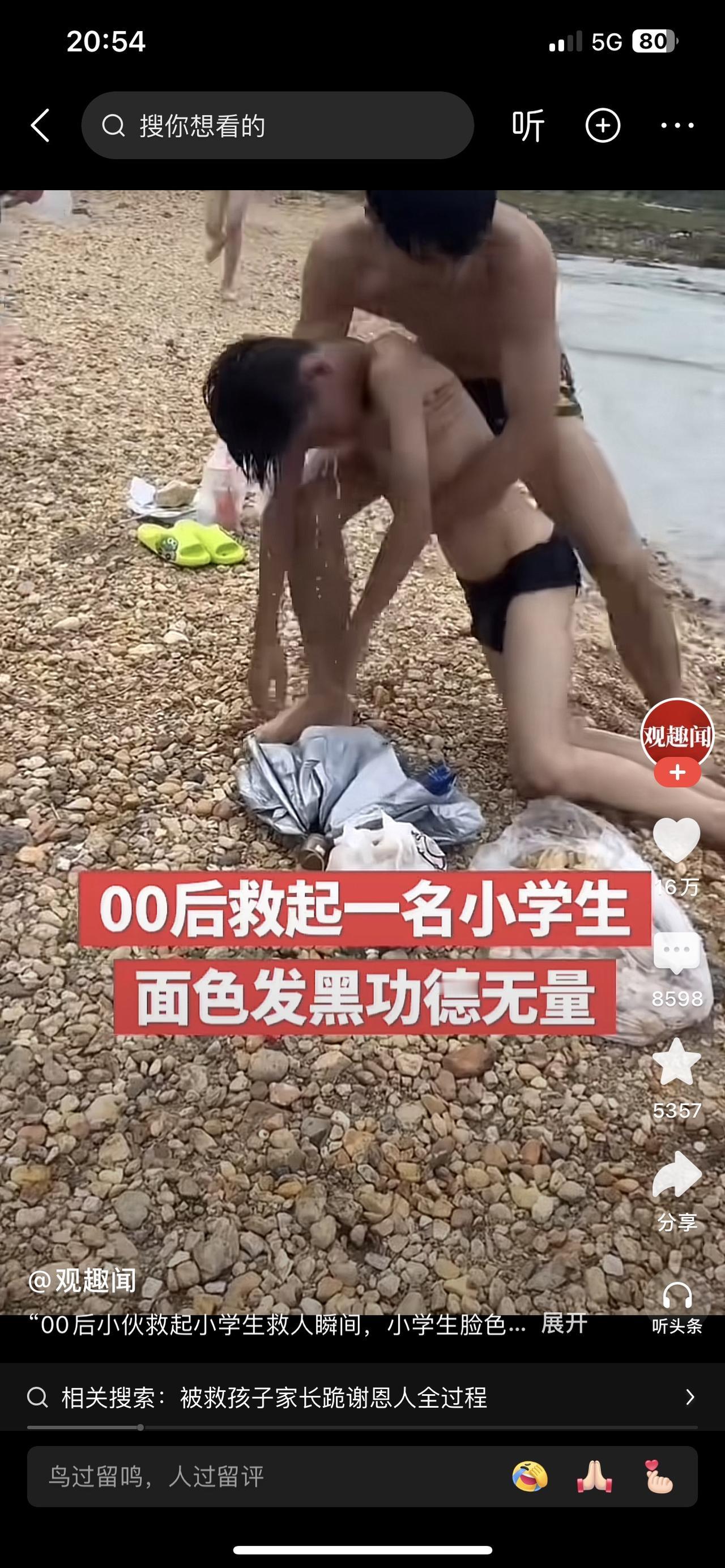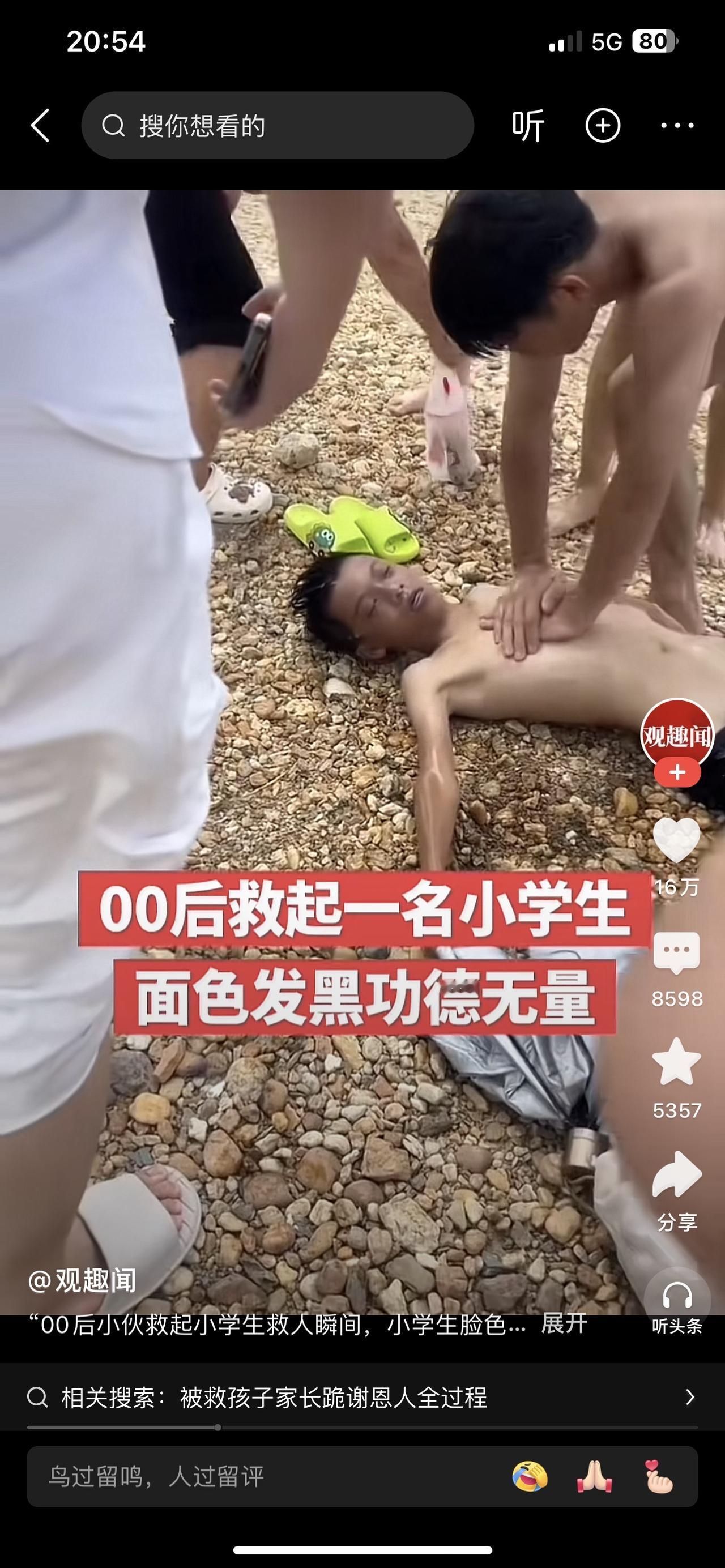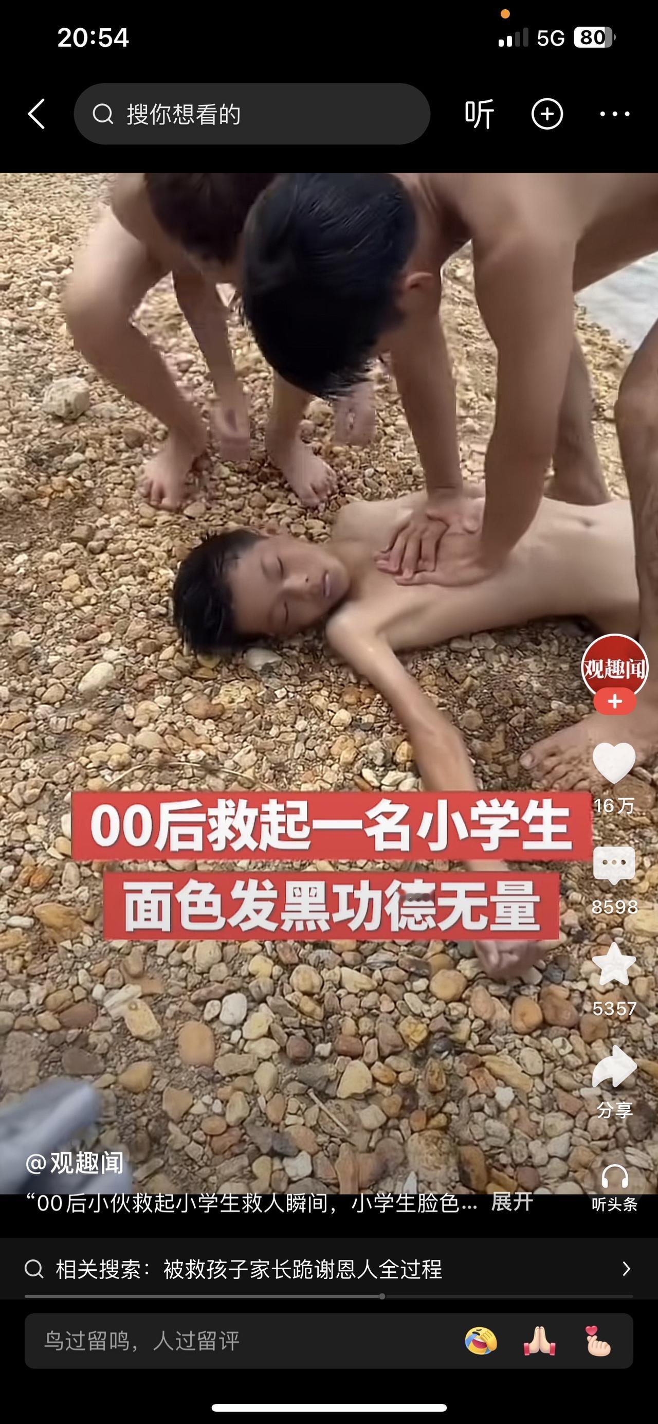 救活了,救活了。心肺复苏成功后孩子脸色马上红润起来了。00后小伙子,好样的。[送自己一朵花][送自己一朵花][送自己一朵花][送自己一朵花]00后救人 当时河边围了不少人,没人敢下水,有人急得喊“快找救生员”。00后小伙刚路过,听见喊声就往河边冲,连外套都没脱就跳了下去。 他把孩子抱上岸时,脸色发黑,嘴唇发紫。旁边有人说“别救了,可能来不及了”,小伙没理,立刻跪下来做心肺复苏。 按压、吹气,重复了好几遍,孩子还是没反应。有人劝他放弃,小伙额头全是汗,手都在抖,却没停下动作。突然孩子吐出一口水。 孩子家长赶到时,扑通就给小伙跪下了,小伙赶紧扶起来,说“这是我该做的”。后来才知道,小伙刚学完急救课没多久,没想到真用上了。 有人说他胆子大,也有人说他运气好。但只有小伙知道,当时没想那么多,就觉得这孩子不能有事,多坚持一秒,就多一分希望。心肺复苏