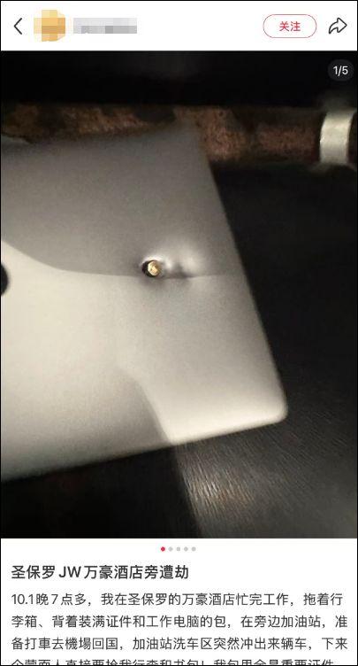 近日,一网友在社交媒体发文称,自己在巴西出差时遭遇持枪蒙面抢劫,包中自己用了五年的笔记本电脑为他挡下一枪。
