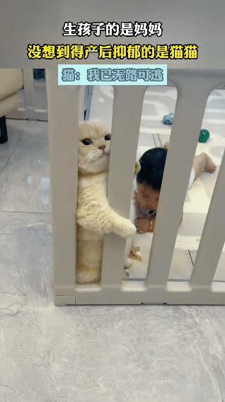 家里新添了宝宝,本以为是妈妈要适应产后生活,结果猫咪却像是“得了产后抑郁”。它被宝宝的小手动来动去,还有那对自己毛茸茸身体的好奇触摸整得没辙,只能把身子卡在围栏间,露出无奈又有点小委屈的模样,仿佛在说“我已无路可逃”,场面又好笑又有点可爱的无奈。猫抑郁症 产后心理状态 搞笑 萌娃
