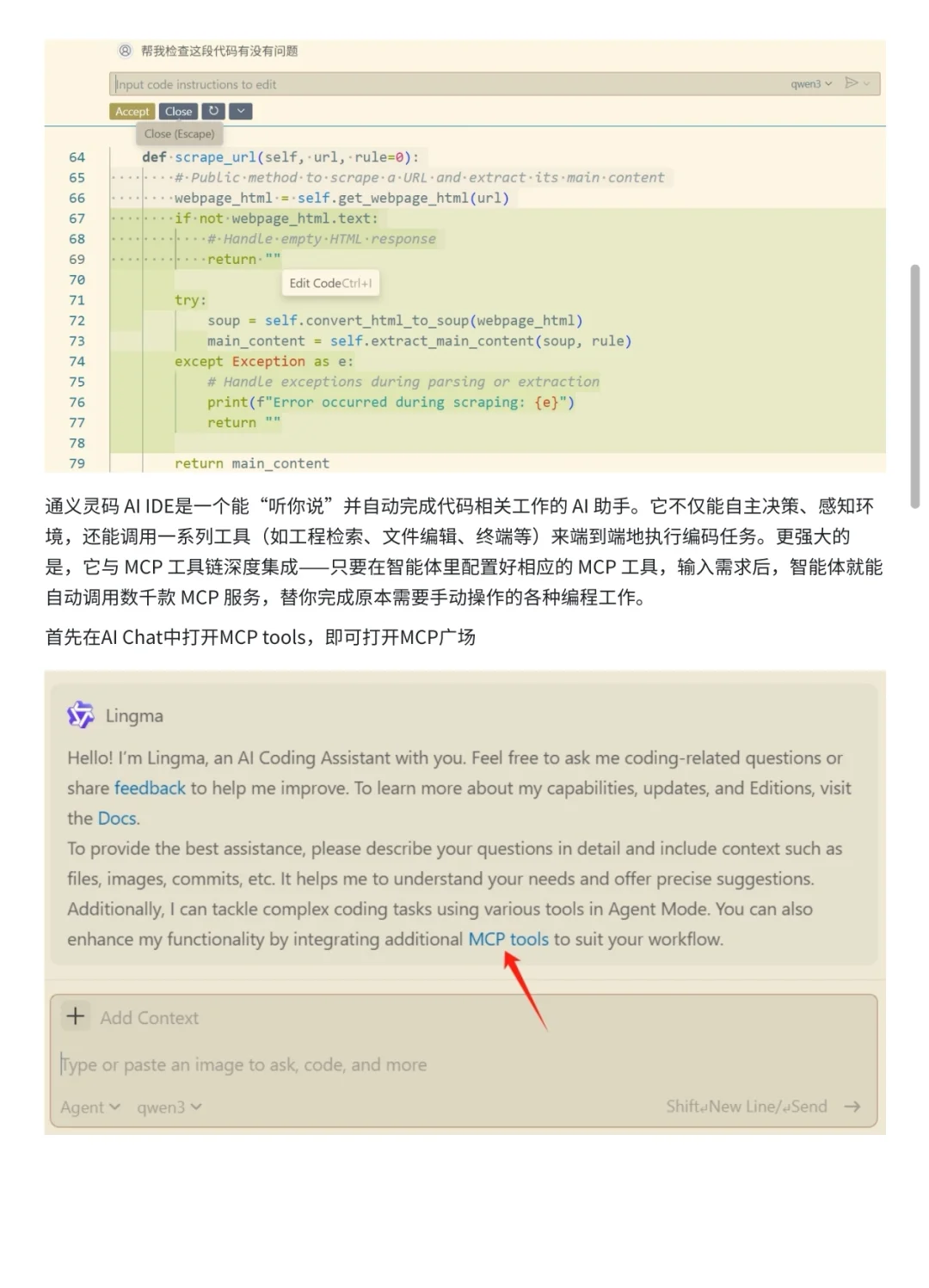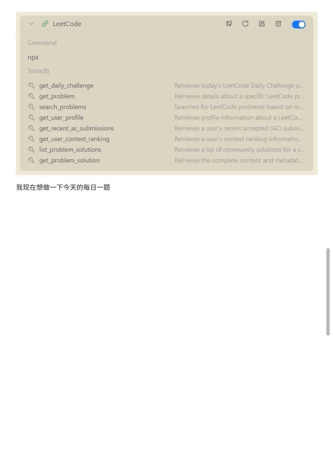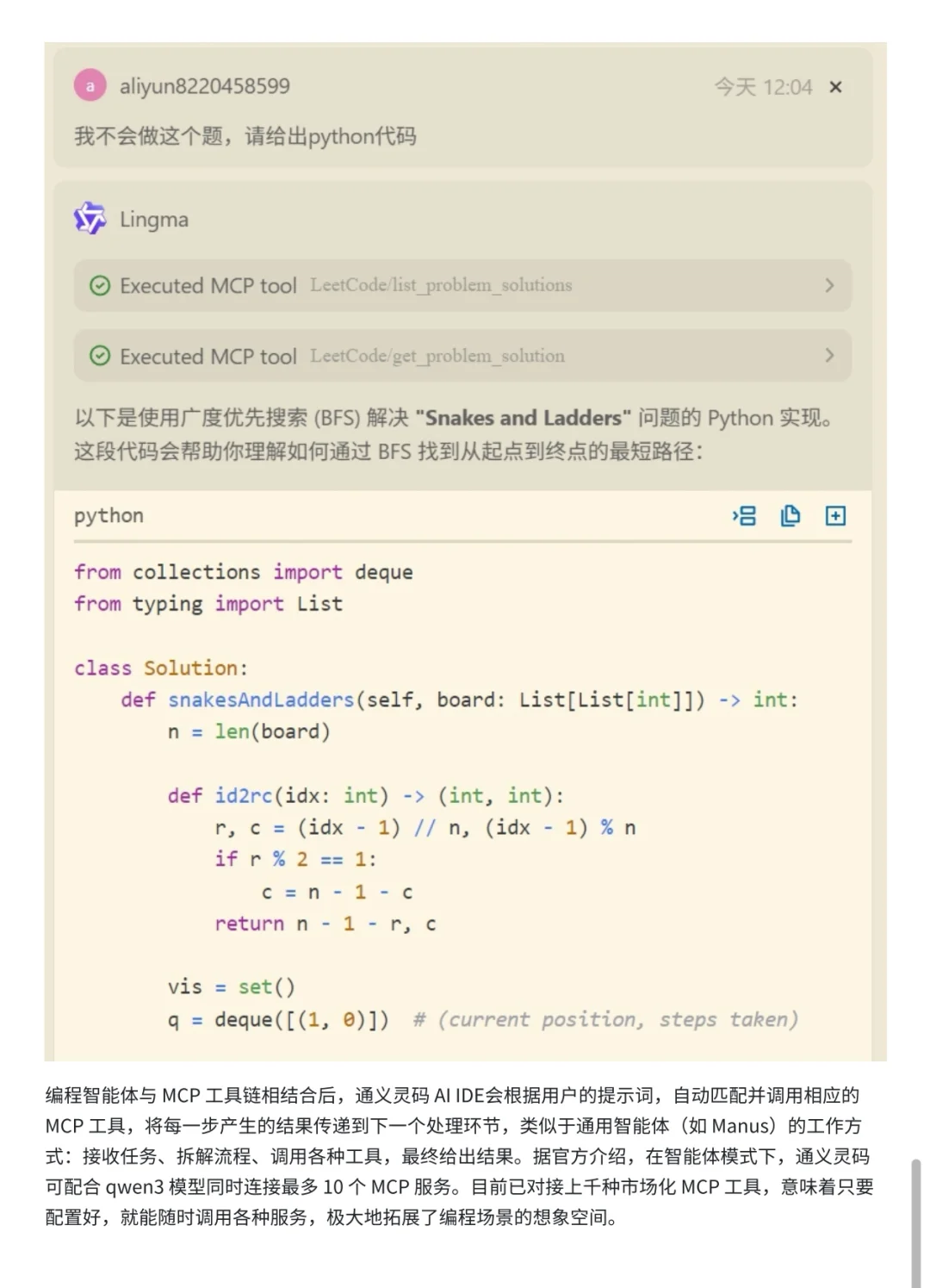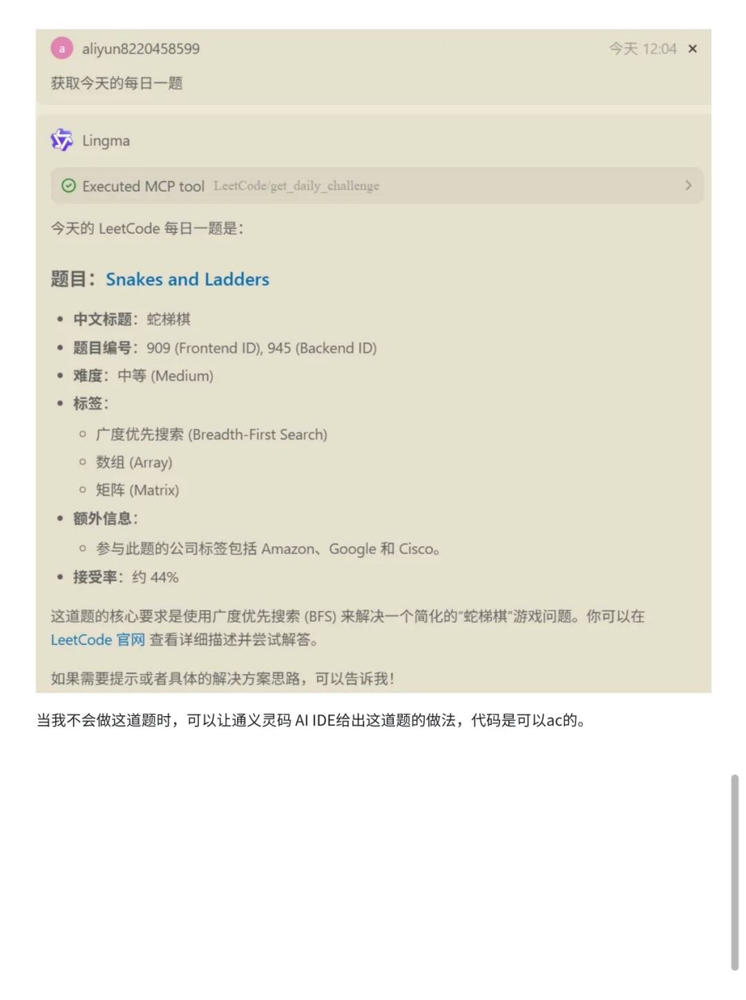 最近体验了一下阿里云新发布的通义灵码AI IDE,感受一句话总结就是:“不用装插件,开箱即用,把AI辅助编程做到了极致!” 以我用通义灵码AI IDE做刷题助手为例,可以直接在IDE里接入LeetCode服务,拉取每日一题,遇到不会的题目还能让AI自动写出AC代码,还能拆解流程、调用各种工具,体验丝滑小连招,效率拉满[赞R] 而且,通义灵码AI IDE支持“编程智能体+MCP工具链”,可以自动调度各种开发工具,拓展性非常强。[得意R]