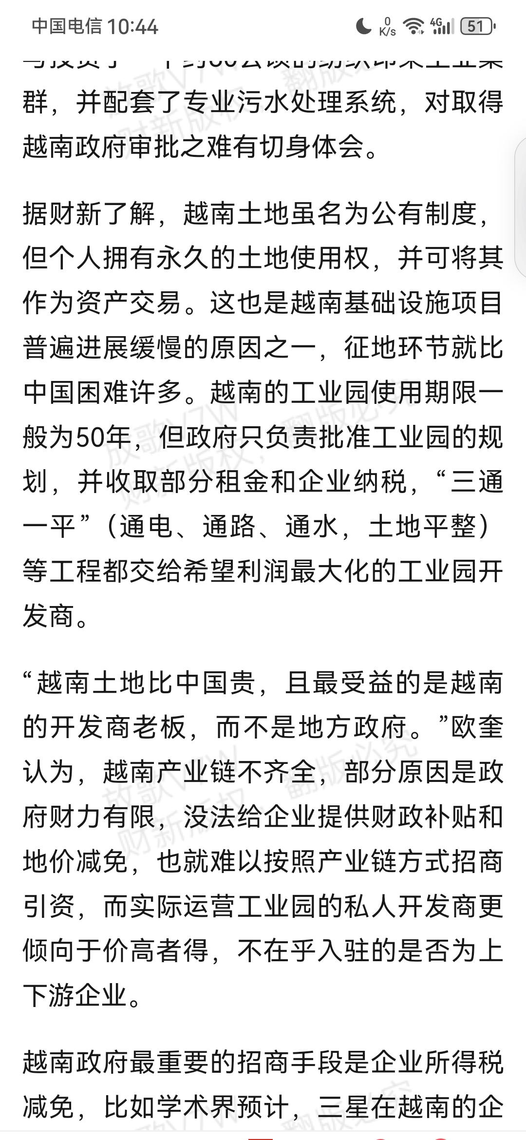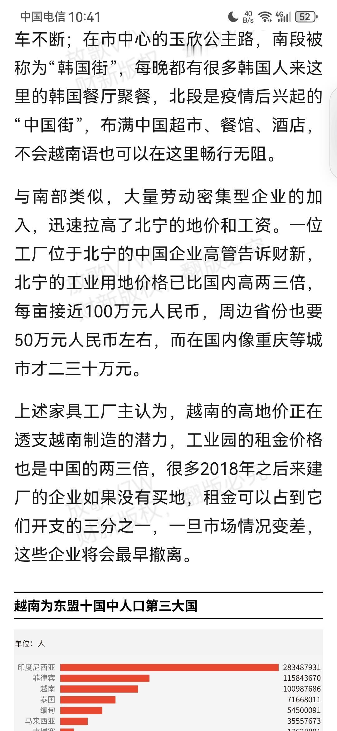 越南制造业已经快发展不下去了。 前段时间,财新网做了一个专题报道,介绍了现在越南制造业的具体发展情况,结果不容乐观,主要有三个巨大的问题。 首先是越南已经没有了人工成本优势。现在越南的工人,工资已经涨到了2500~3000块人民币一个月,这样的工资水平跟我国中西部地区差不多。但是我国中西部地区工人的工作效率,至少是越南工人的两三倍,这样一对比下来,越南已经没有任何的人工成本的优势。 之前一直有观点认为越南最大优势是年轻人多,人工成本低,实际上现在这个情况已经彻底变了。 其次是越南征地成本越来越高,工业用地的价格也越来越高。发展制造业,是需要大量土地用来建造工厂的,可是现在越南征地成本很高,需要花很高的价钱才能征地成功,同时工业园区的工业用地价格,也自然水涨船高,其价格甚至已经超过了中国,已经是中国的两三倍! 比如说越南北宁的工业用地,一亩地需要100万人民币,而在中国重庆,一亩地只需要二三十万。 发展制造业,工业用地成本必须要低,可现在越南这个高地价,违背了这个规律,使得制造业的发展,遭遇了巨大阻碍。 最后,则是基础设施跟不上。发展制造业,需要有充足的电力供应,要通路、通水、平整土地,可是这些越南都做得不好,尤其是发电,更是老大难题,这些都进一步阻碍了制造业的发展。 不再具有优势的人工成本,征地越发艰难,高昂的工业用地价格,以及基础设施的不足,等等,这些因素综合起来,导致现在越南生产的商品,普遍都比中国生产的贵15%! 生产出来的商品的价格,比中国都还要贵,这代表着越南的制造业产品,已经毫无竞争力。 所以说,现在越南的制造业,是真的遇到问题,快要发展不下去了!
