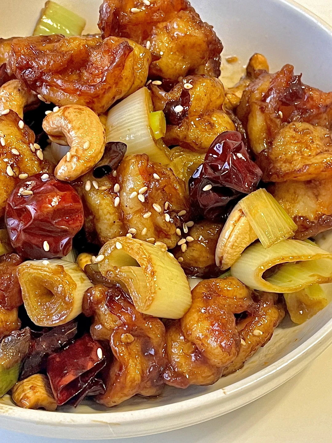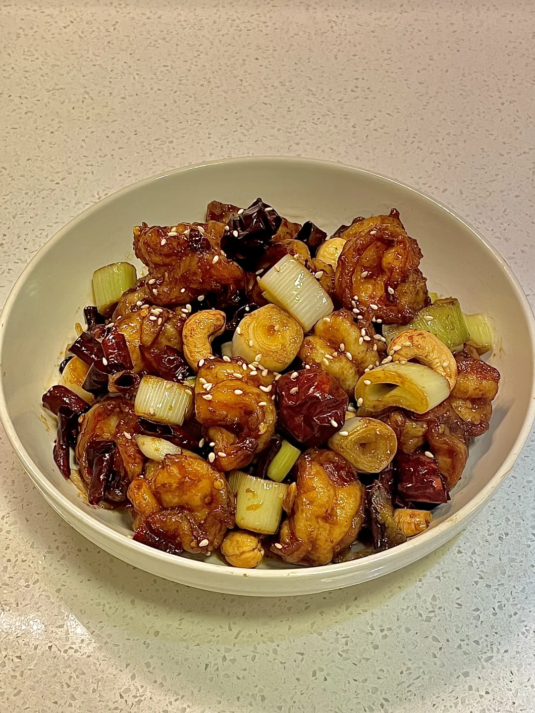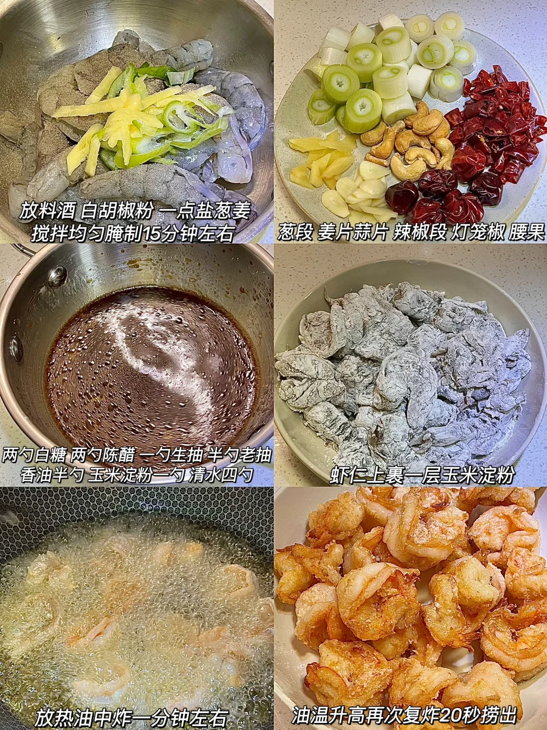 食材:虾仁 葱段 蒜姜 辣椒段 灯笼椒 腰果
