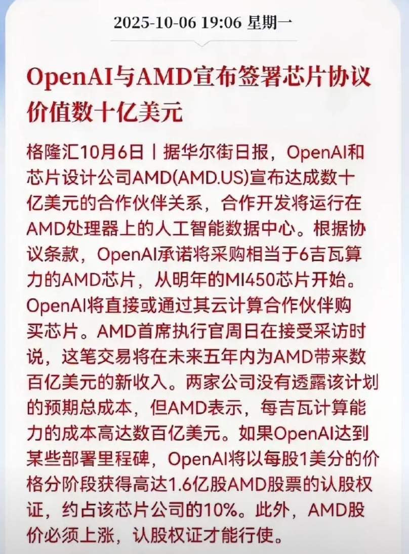 AMD开盘涨幅超过30%,现在市值3400亿美元。OpenAI与AMD的协议将在未来五年为AMD带来数百亿美元的收入。而且OpenAI也将会入股AMD,最多将持股10%。不过OpenAI的认股权证认购价格只有1美分,AMD相当于白送股权给OpenAI。但OpenAI必须得让AMD股价上涨,才能行权。