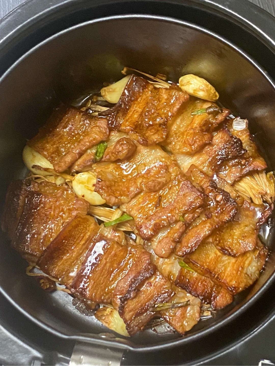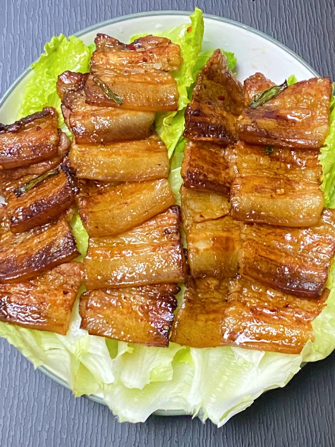 家人们!空气炸锅五花肉来了!! 和韩国烤肉店的味道泰像了!!! 一口生菜包一口五花肉!简直上头!! 再来杯米酒!在家实现烤肉自由啊啊啊!! ——————— 香烤五花肉 准备食材: 五花肉洗净切片、 刷料: 香油、大蒜、孜然粉、辣椒面、刷料 做法: 1、将五花肉片➕葱段、姜丝、生抽,小米椒、盐腌制30分钟。 2、将五花肉放炸锅!刷上料!撒孜然粉辣椒面180度!6分钟!后翻面加刷料!烤制5分钟! 3、撒芝麻烤制3分钟即可开吃! ——- 鲜香可口!吃而不腻!降脂降卡