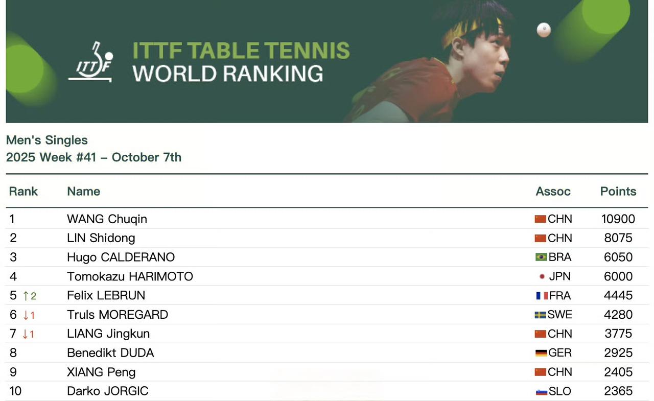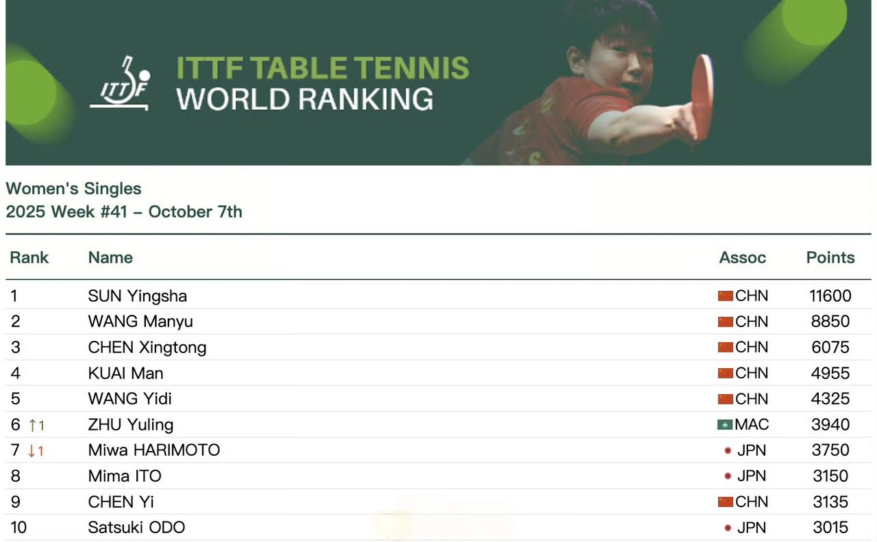 王楚钦太牛了!成为第一个突破10000分大关的男选手,现在积分已经冲到10900分,稳稳坐在世界第一!🔥 这次他在WTT中国大满贯男单决赛里,直接4比0横扫法国小将费利克斯,强势夺冠,这状态真的没谁了! 不过大头这个第一拿得也不容易。今年2月,才19岁的林诗栋在新加坡大满贯夺冠,积分反超他,成了史上最年轻的男单世界第一。 王楚钦等了217天,直到9月澳门冠军赛重新夺冠,才终于回到第一宝座,这过程也太励志了! 女单这边,孙颖莎更是稳如泰山!已经连续169周世界第一,差不多三年没挪过位置,这统治力太强了。 目前她11600分断层领先,王曼昱8850分排在第二,陈幸同、蒯曼、王艺迪紧随其后——咱们女队直接承包前五名,太提气了! 虽然前几天北京大满贯女单决赛王曼昱赢了莎莎,但莎莎积分优势太大,第一把交椅纹丝不动~ 再看看历年来的世界第一,咱们国乒真是星光熠熠: 男单有王涛、孔令辉、刘国梁、王励勤、马琳、王皓、马龙、张继科、许昕…… 女单除了莎莎,陈梦、王曼昱、王艺迪也都长期稳居前列。 国球就是国球,这实力杠杠的,继续期待队员们狂揽金牌呀!🇨🇳 赛场雄狮王楚钦 王楚钦荣耀夺冠 大满贯王楚钦 孙颖莎