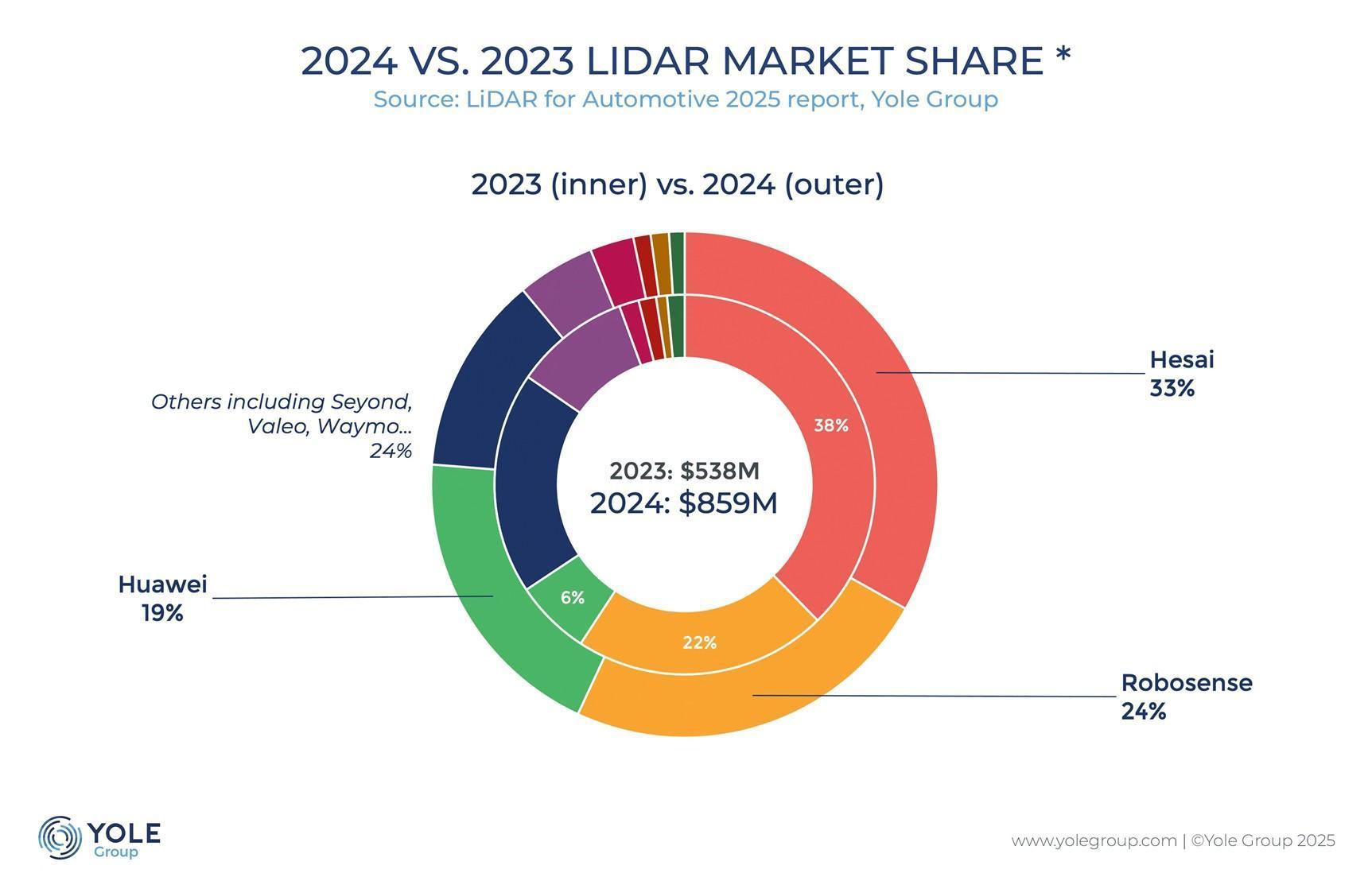 据《2025年全球车载激光雷达市场报告》显示,2024年全球车载激光雷达市场迎来爆发式增长,市场规模攀升至8.61亿美元,同比增长60%。在这一背景下,禾赛以33%的市场份额连续四年位居全球总营收榜首,在产品性能、量产交付及全球化布局上展现出强大的综合竞争力。