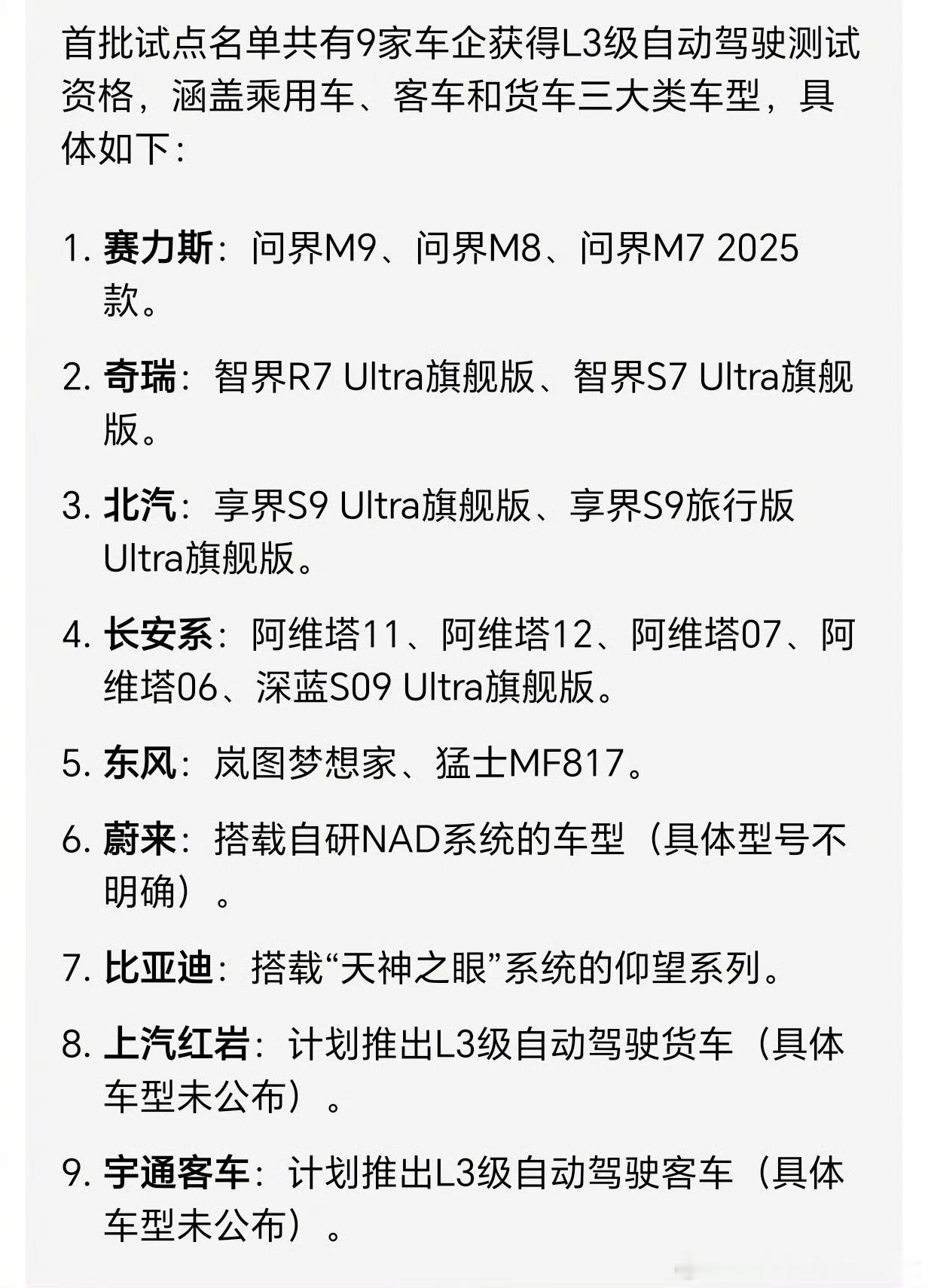 新能源大牛说看了一下L3试点的车型名单基本上都是搭载华为ADS的车型​​​