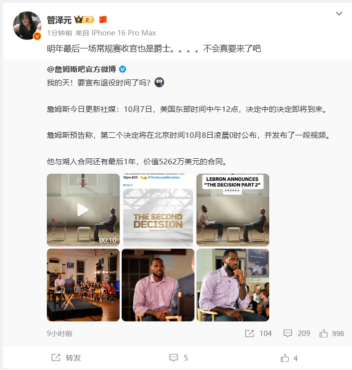 管泽元社媒转发相应动态聊到老詹:“明年最后一场常规赛收官也是爵士。。。。不会真要来了吧”