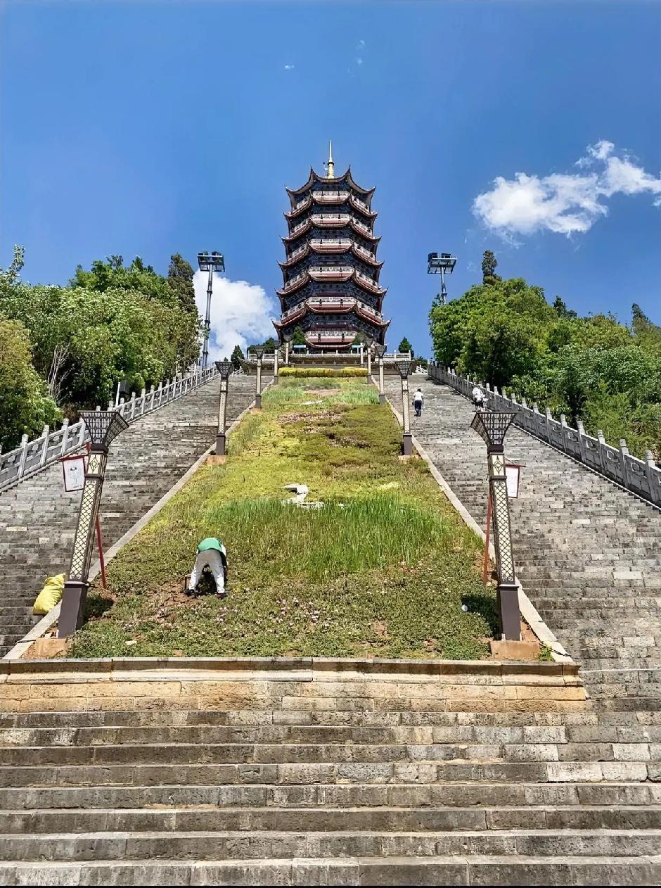 这是云南文山文笔塔。 是当地标志性古建筑,具有深厚的历史文化底蕴。 有“文山分手塔”的网络别称,增添了其在年轻群体中的话题性。 周边自然风景优美,有宽阔的石阶登山路径,可让游客在登山过程中欣赏到融合了人文建筑与自然绿意的景观,是感受当地文化与自然景观融合之美的好去处。 来文山文笔塔这趟,可把我爽到了! 爬那一大串台阶时,累得我气喘吁吁,但一抬头见着那塔在蓝天底下立着,就跟画里的一样,瞬间觉得值了!