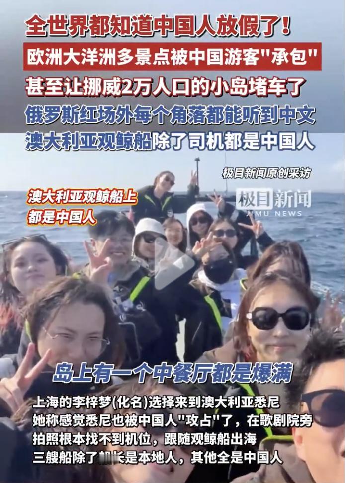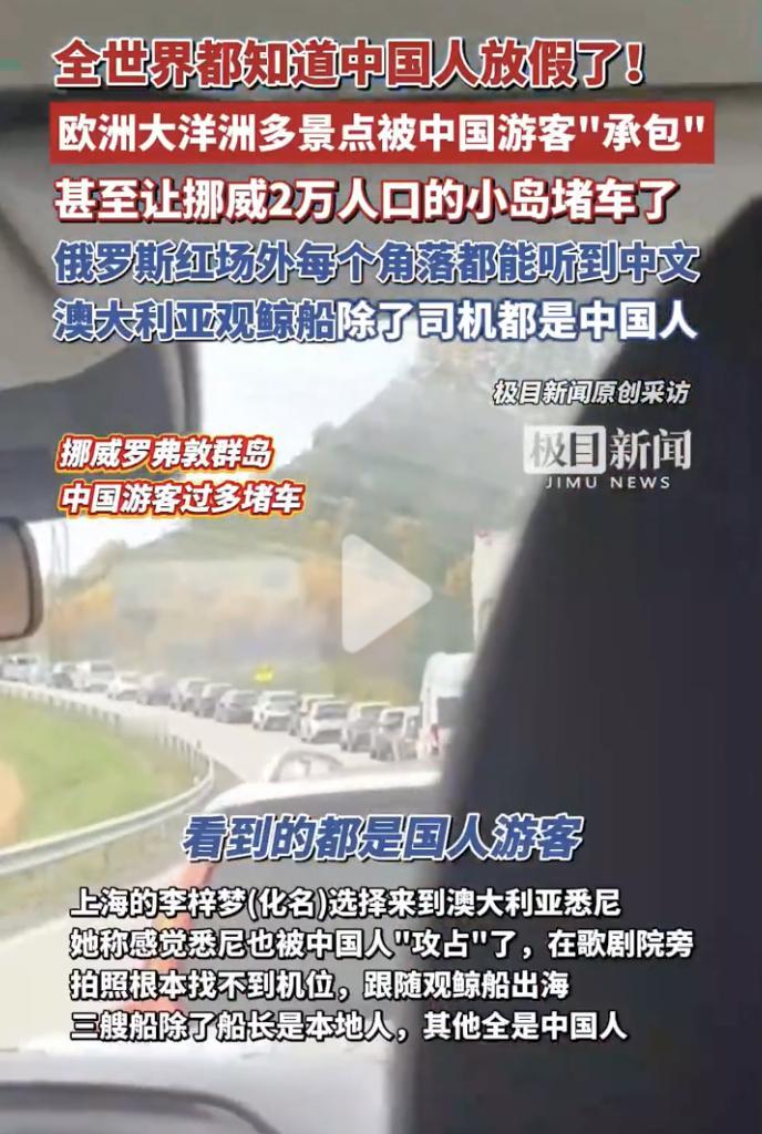 这下好了,不仅中国人知道了,全世界人都知道了! 这几天国庆小长假,人们纷纷走出家门,到自己喜欢的城市和景点游玩,国内大大小小的景点都是旅游的游客,北京故宫、上海外滩、夫子庙、西湖、泰山、九寨沟,就连鸣沙山都是摩肩接踵,人满为患。 你以为只是国内景点游客多吗?错了,现在全世界都是中国游客,俄罗斯红场到处都能听到中文,澳大利亚观鲸船除了司机外都是中国人,欧洲各大景点都被中国人包场了…… 更过分的是,挪威一个只有两万人的小岛,竟然因为中国游客的到来而堵车了,岛上各个角落随处可见中国人的身影,岛上的一家中餐馆更是被中国人挤爆了。 这下可是把外国人都看呆了,他们甚至都以为中国是开始过春节了。真佩服这些游客,国内玩够了,都开始去国外玩了,不是说消费降级了吗?我怎么感觉只有我自己降级了,这个国庆假期是不是只有我自己呆在家里哪也没去?