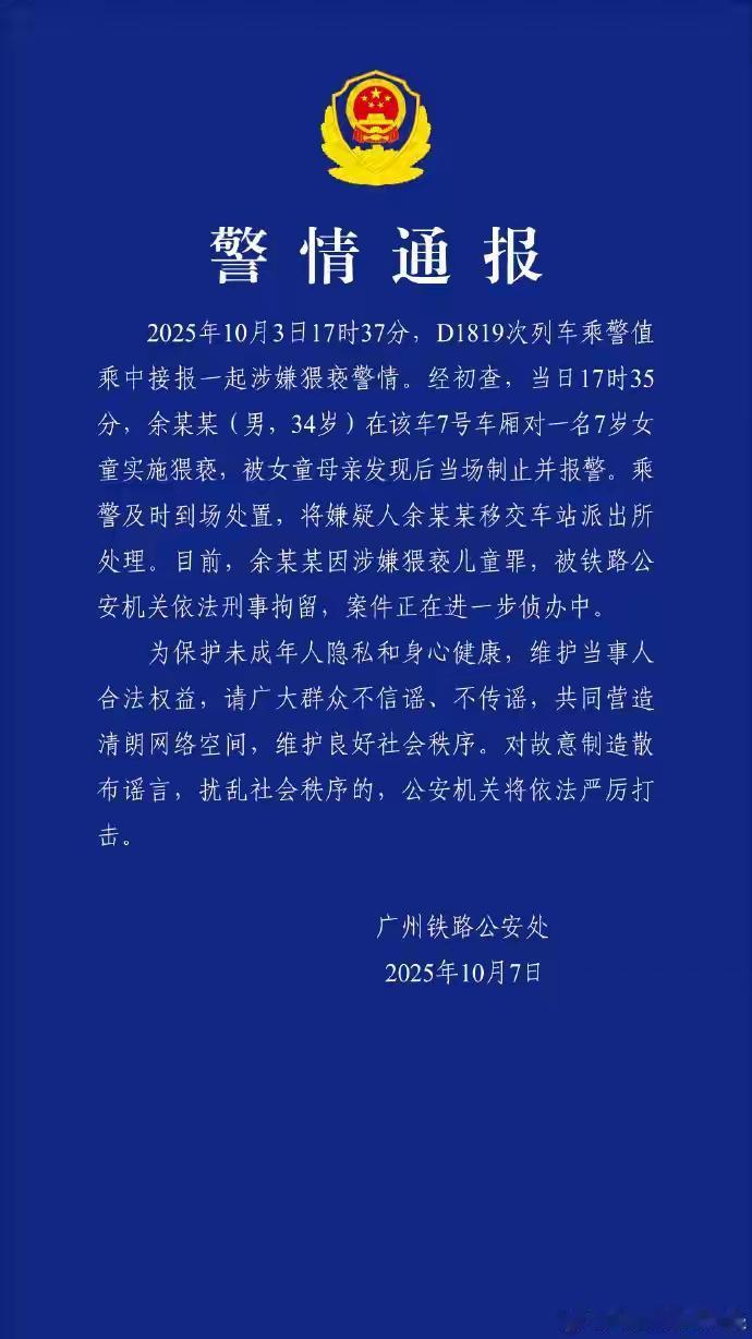 高铁上亲小姑娘的34岁余某某肠子都悔青了,没想到踢到了铁板。在女孩妈妈的坚持下,他被帽子叔叔刑事拘留了。 你说他冤吧,也不冤! 对方根本就不认识你,你凭什么这么做。就算是熟人,女孩子这么大了,一般人也就是牵着手走路,都会知道避讳。 大概率还是这小伙是故意的,觉得女孩家属并不会怎么样,道个歉就够了。 真的要为这个勇敢的妈妈点赞,不仅仅保护了自己的女儿,还照亮了大家,太棒了[玫瑰][玫瑰]