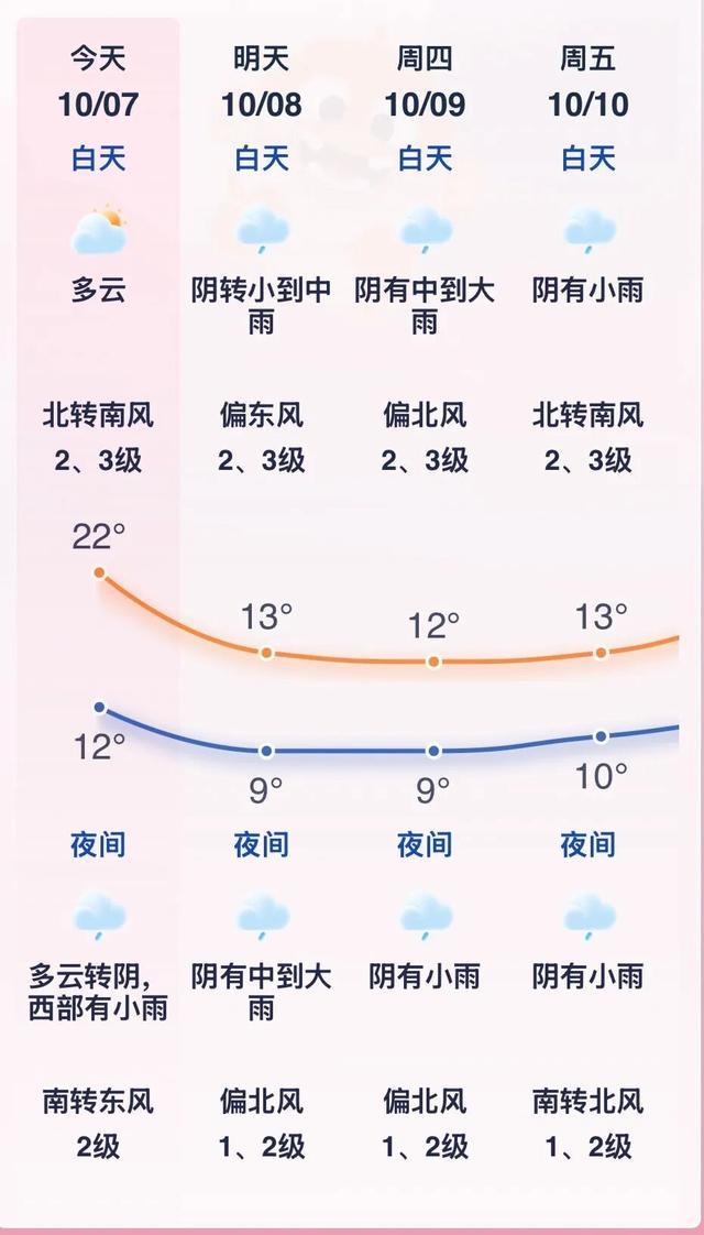 周四(9日)白天:阴有中到大雨,偏北风2、3级,最高气温12℃。