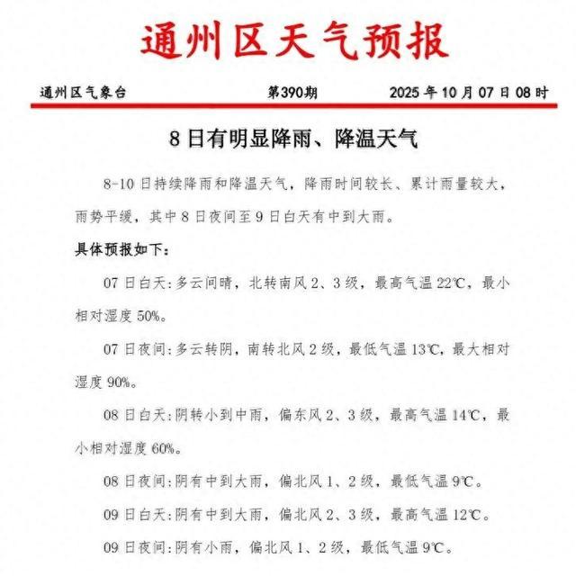 据通州气象台最新预报——