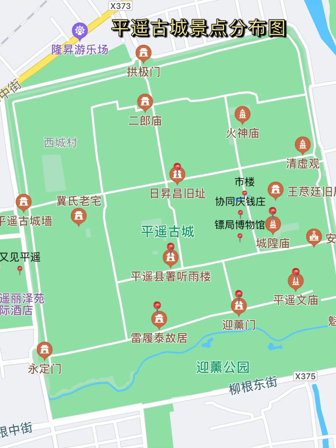 路线:南门入口—迎熏门城墙—云路老街(下城墙)—文庙—城隍庙—镖局博物馆—协同庆钱庄—市楼—日升昌记—听雨楼—衙署—雷履泰故居—又见平遥