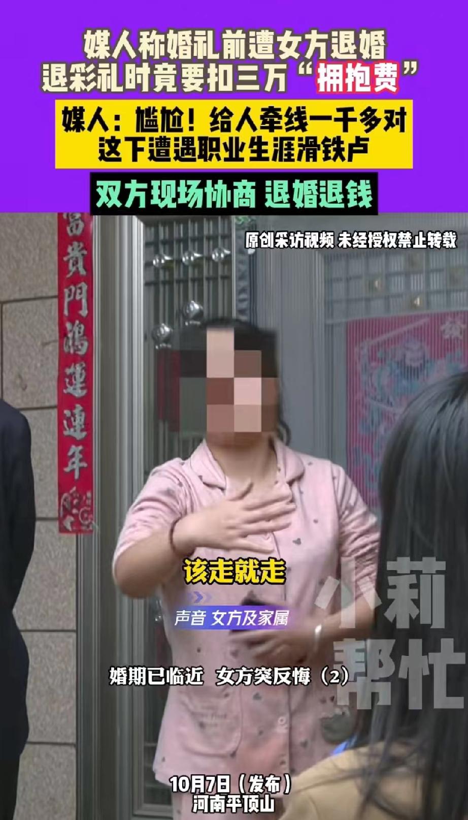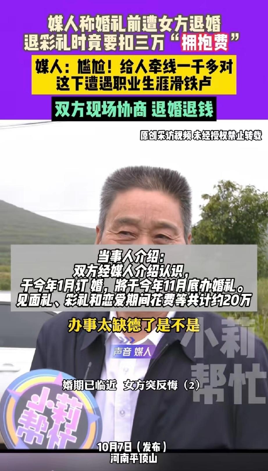 河南平顶山,男子经媒人介绍认识了女子,并迅速订婚,彩礼、五金加上见面礼等,共花20万元。婚期定好后,两人拍了婚纱照,男方家定了酒店并通知了亲戚,就等着把新娘娶进门。谁知,到了最后关头,女子竟突然反悔,死活不结婚了。强扭的瓜不甜,既然结不成,男方要求退还20万元,谁知女方表示,要扣3万元拥抱费。70多岁的媒人瞬间怒了:说成了一千多对,竟然遭遇了事业滑铁卢,就不是人干的事,太缺德了! 万先生到了结婚年纪,父母四处托人给他介绍对象,终于,去年经媒人介绍,他认识了一个女子。 双方都很满意,所以只谈了几个月,在家人的催促下,两人于今年1月订婚。 订婚时,按照当地习俗,男方家给了女方6万6彩礼,四金花了6万,还买了电脑、手表、手机等,七七八八花了20万元。 定好婚期后,小两口开开心心去拍了婚纱照,万先生父母一刻也没闲着,订酒店,通知亲戚,安排摄影和车队等等。 本以为新媳妇马上就能娶进门,万万没想到,一切准备妥当后,女方突然表示,这婚他不结了。 这突如其来的翻脸让男方一家猝不及防,万先生想不通,谈的好好的,都快一年了,为什么说不行就不行? 他找到女孩要个说法,从她的言语中,万先生终于得知,女子是嫌他工资低,而且人又太老实,不会来事,以后混不开。 女方一家的行为让70多岁的媒人尴尬又气愤,他退休十来年了,一直在当媒人,给年轻人牵线搭桥,说成了1000多对,从没有遇到这种情况。 临近婚期退婚不说,还迟迟不给男方退彩礼钱,这简直就不是人办的事,太缺德了。 他夹在中间很难做,这也算遭遇了事业上的滑铁卢。 女方为何突然悔婚,又为何不退彩礼钱呢?到底是嫌男方挣得少,还是另有隐情? 男方家和媒人一起找上门去,讨要说法。 女方表示,不存在嫌他工资低一说,男方是在胡说八道,交往近一年,两人性格不合,没有共同话题,说不到一块去,干脆分开,及时止损。 既然婚结不成,那把彩礼钱退回来不就完了吗? 男方通过计算,见面礼、彩礼钱加上恋爱期间给对方的转账以及买礼物的钱,一共花了20万。 其他损失,像酒店订金、拍婚纱照等钱他们也就不计较了,只要把20万大头退回来,两家就井水不犯河水,此事罢休。 可万万没想到,女方竟然表示,只能退他17万,必须扣掉3万元拥抱费。 原来,两人拍婚纱照时,摄影师为了摆造型,让两人拥抱了一下。 女方的要求实在让人无语,摄影师让摆的造型,又不是男孩子非要抱她,而且,人家抱你,你难道没有抱人家吗? 对此,女方家属回应,确实说过3万元拥抱费,但其实不是拥抱着一下,涵盖了两人恋爱期间,女方所有的花费。 真是滑天下之大稽,第一次听说拥抱还要收费,丢人现眼,女方家真是想钱想疯了。 相信经此一事,女方一家在当地的名声肯定臭了,周边的男子一定要注意,拥抱一下就扣人家3万元,那拉个手、接个吻,不知道要扣多少钱,千万不敢被她讹上。 法律规定,彩礼是以婚姻为目的依据习俗给付的财物 。 男方给女方的6万6彩礼、四金6万以及电脑、手表、手机等大额财物,可认定为彩礼范畴。 《最高人民法院关于适用婚姻家庭编的解释(一)》第五条规定:当事人请求返还按照习俗给付的彩礼的,如果查明属于以下情形,人民法院应当予以支持: (一)双方未办理结婚登记手续; (二)双方办理结婚登记手续但确未共同生活; (三)婚前给付并导致给付人生活困难 本案中,双方并未办理结婚登记手续,完全符合第一项规定的“双方未办理结婚登记手续”的情形。 因此,男方有权要求女方返还按照习俗给付的彩礼、见面礼等财物。 而且,女方在婚期临近时单方悔婚,是导致婚约解除的根本原因,其行为不仅违背了诚实信用原则,也给男方造成了经济上的损失和精神上的伤害。 女方的行为构成了根本违约,应承担相应的法律责任,即全额返还其收取的彩礼等财物。 对于女方提出的三万元“拥抱费”,属于其单方提出的、缺乏法律依据的扣款理由。 在法律上,恋爱期间的拥抱等亲密行为属于情感交流的范畴,不构成法律意义上的“服务”或“对价”,不能成为拒绝返还彩礼的合法理由。 该主张实质上是试图将情感行为“商品化”,与公序良俗相悖,不应得到支持。 最终,男女双方自行协商一致,女方退还了万先生家17.5万元现金。